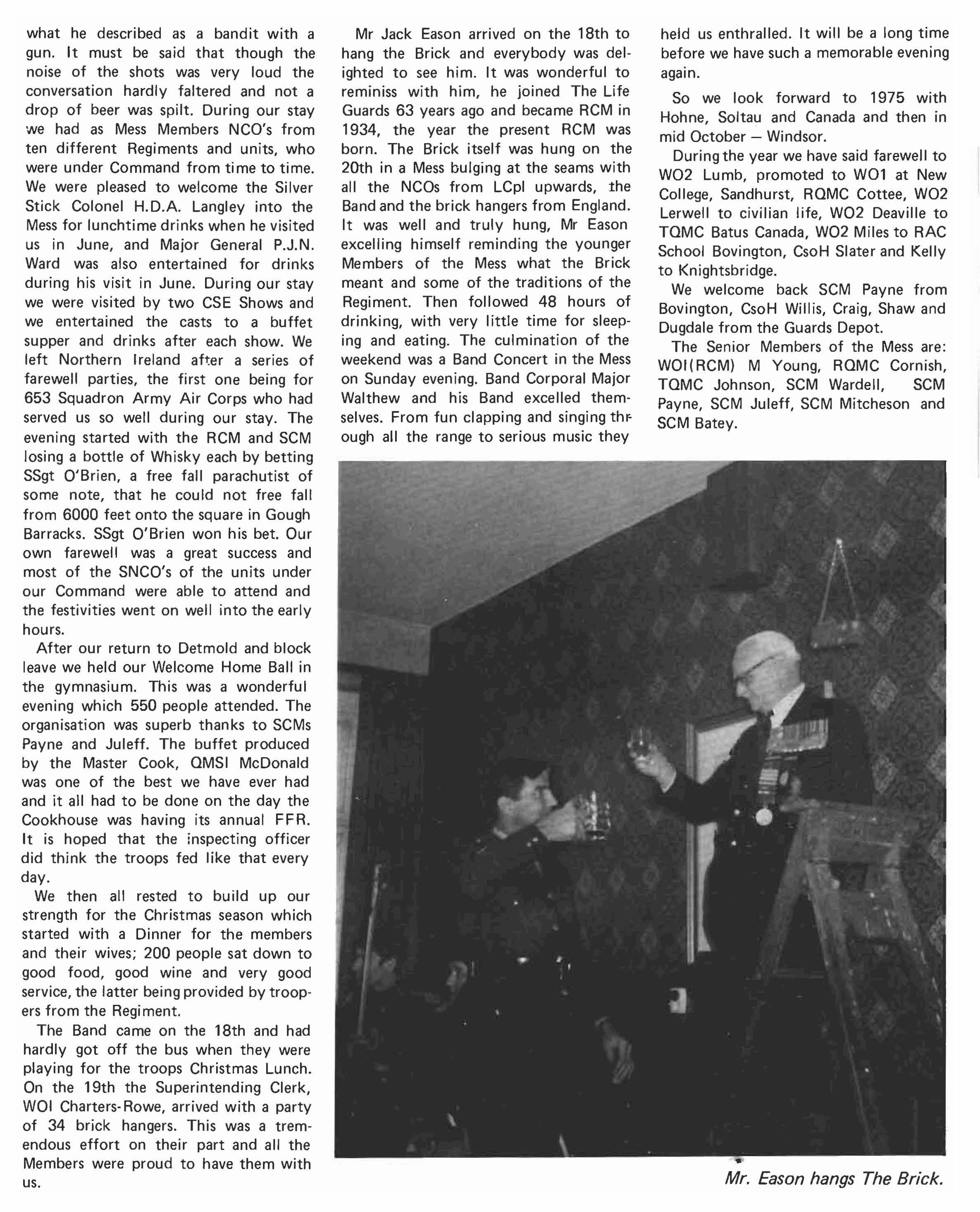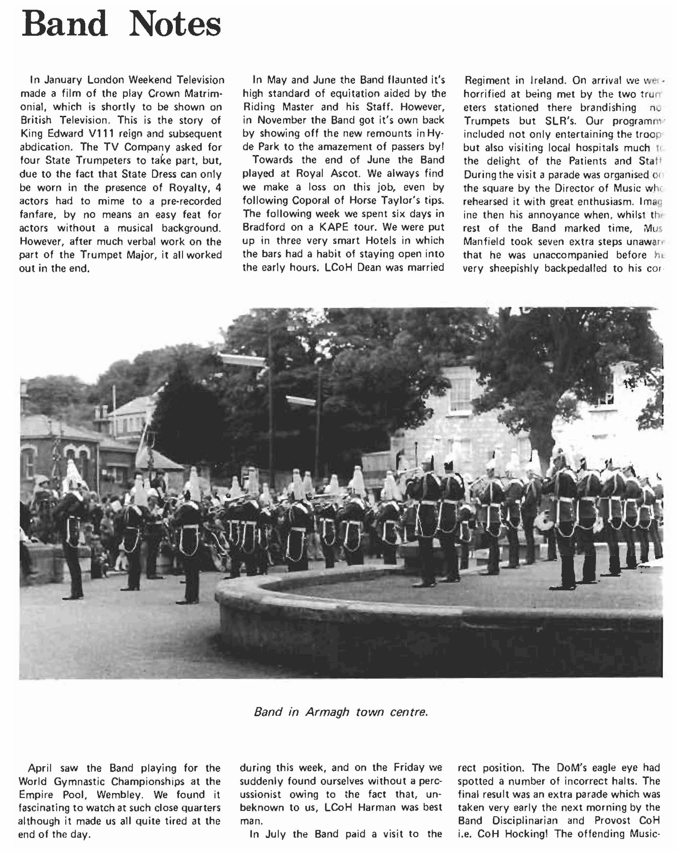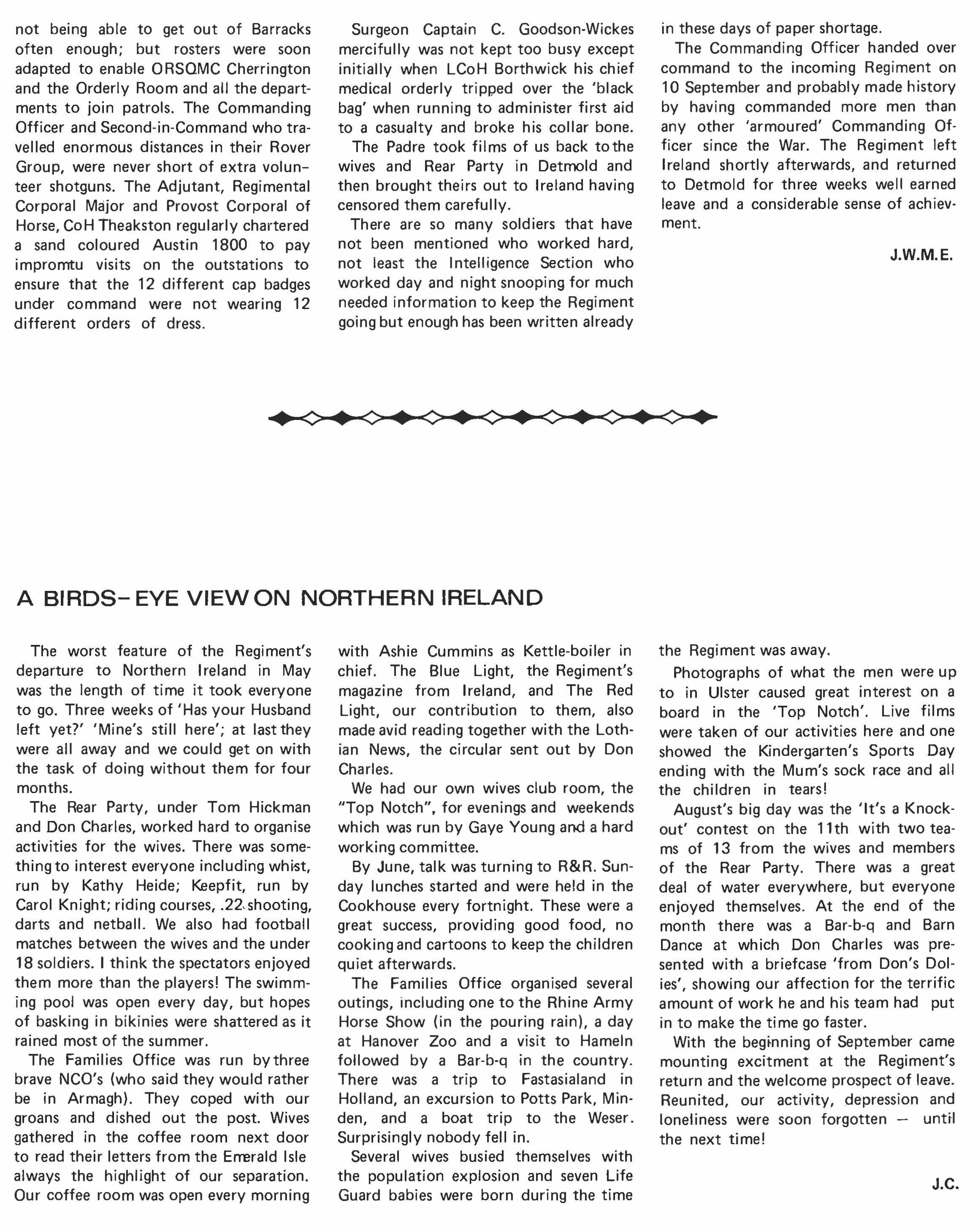 1974 has been a year of very considerable achievement for the Regiment. We started the year by earning an 'A' grading on our annual firing at Hohne. A very notable performance for a regiment in only its third year on Chieftain tanks. In May, after a period of reorgan isation, we left for Northern I reland and carried out an emergency tour in the countryside of Ulster based on Armagh. Unlike our previous tour in Belfast we acted as mounted infantry and between May and September we controlled an area of 1350 square kilometers and had under comm· and up to six Infantry Companies as well as our own two Squadrons. We returned from Ulster justly proud of ourselves after a tiring tour well done. At the same time we should not forget the support and extra work of our rear party and families. Without it life in Armagh would have been far more difficult.