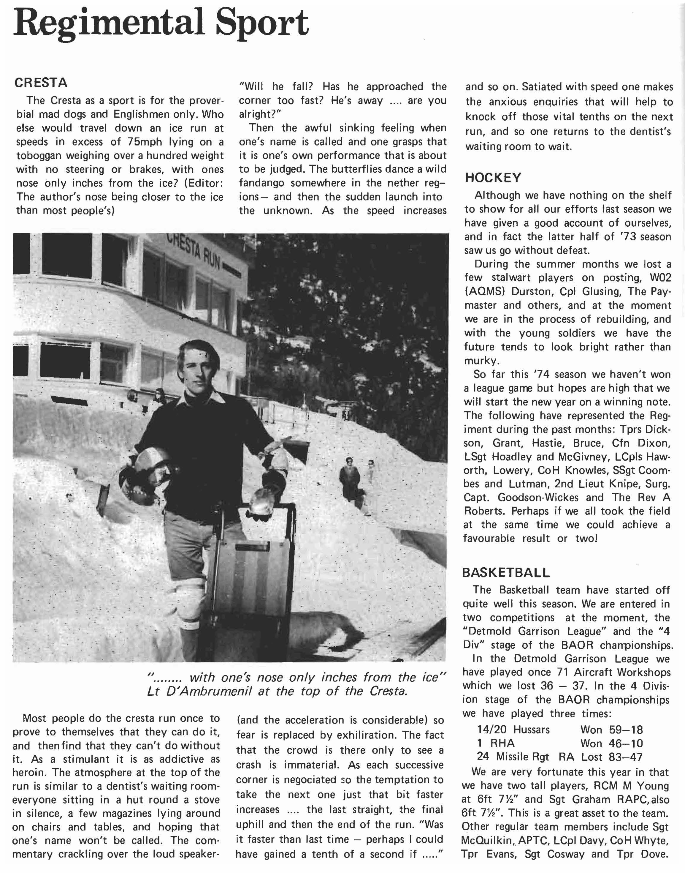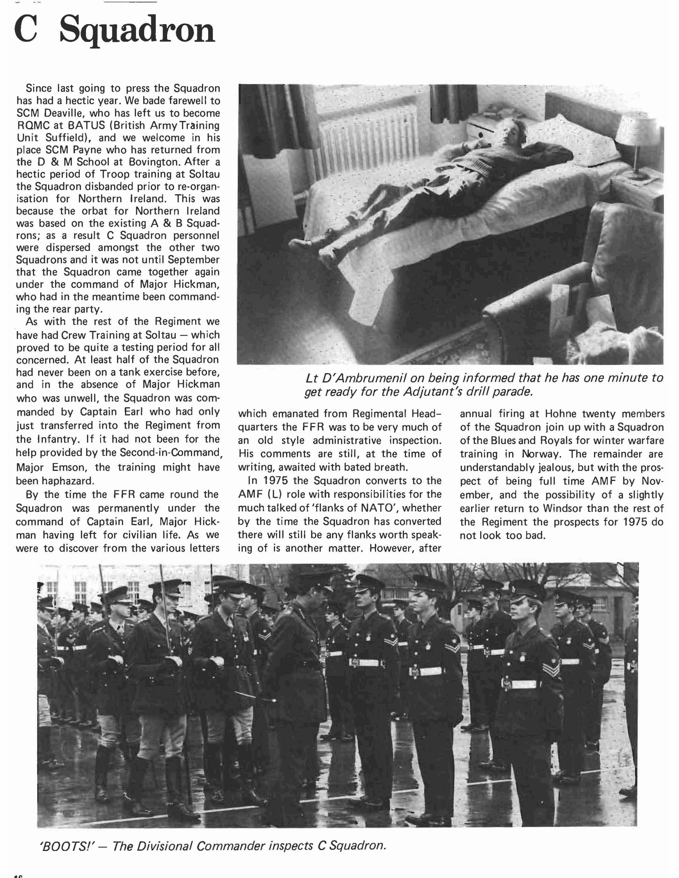 annual firing at Hohne twenty members of the Squadron join up with a Squadron of the Blues and Royals for winter warfare training in Norway. The remainder are understandably jealous, but with the prospect of being full time AM F by November, and the possibility of a slightly earlier return to Windsor than the rest of the Regiment the prospects for 1975 do not look too bad.