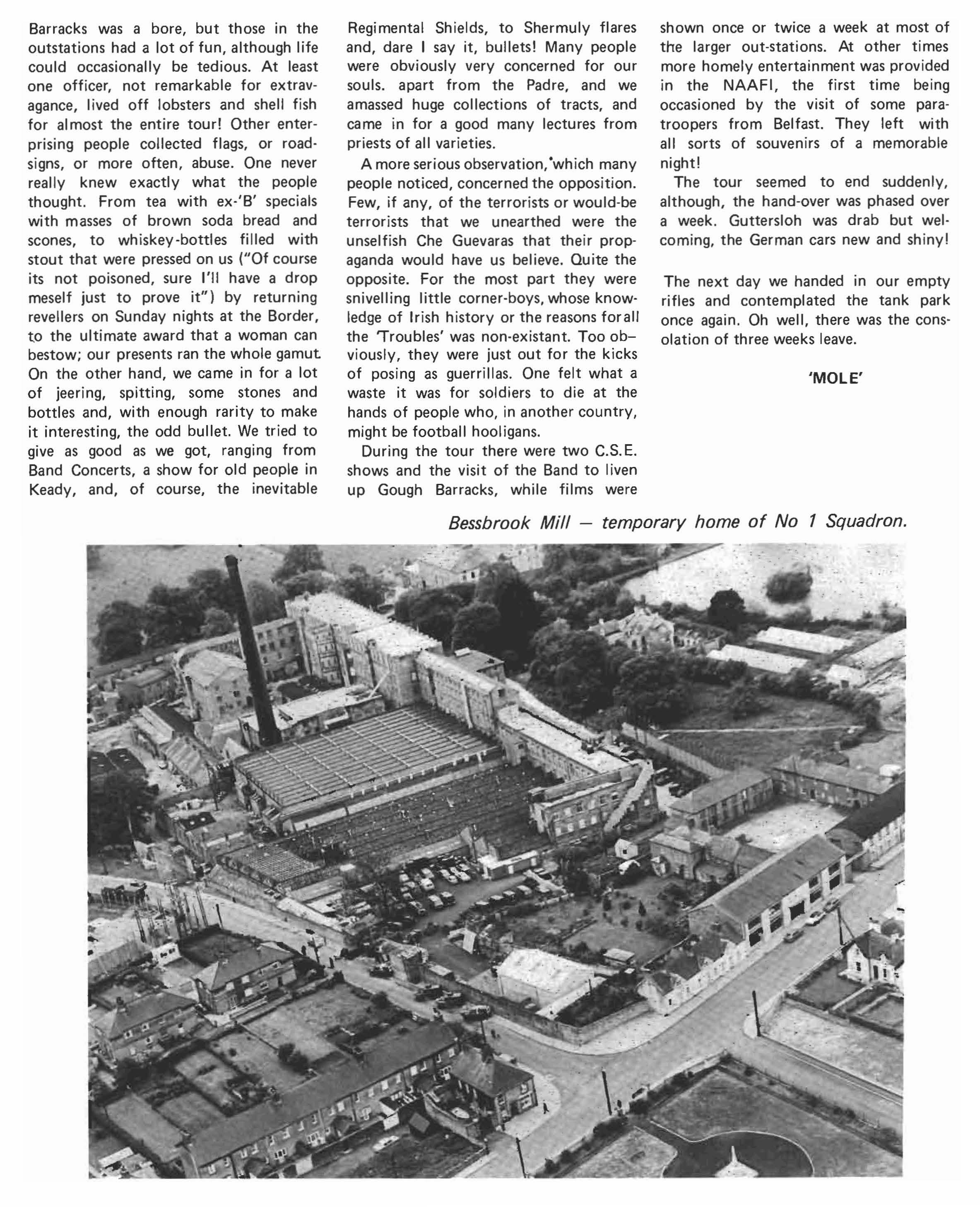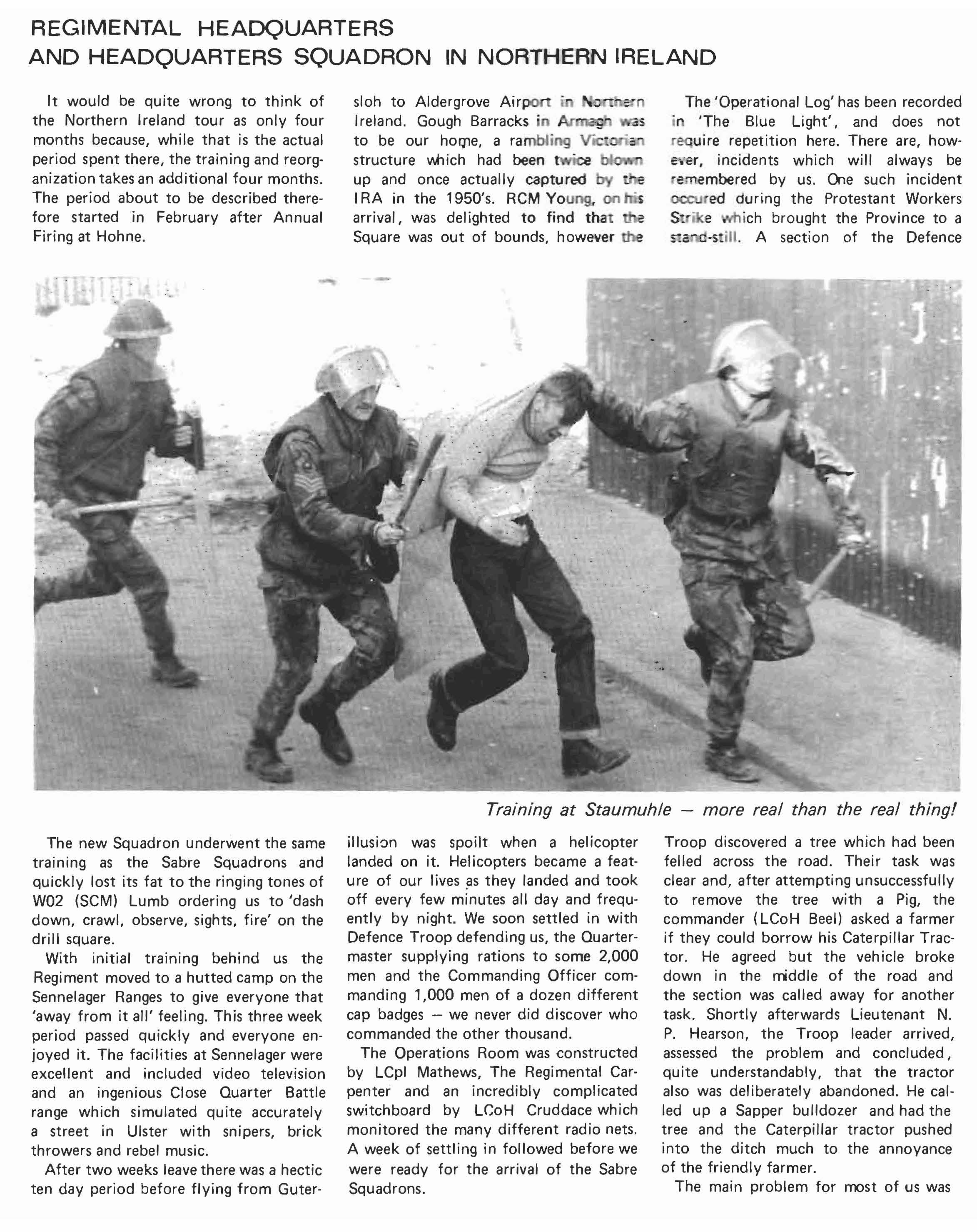 Since last going to press the Squadron has had a hectic year. We bade farewell to SCM Deaville, who has left us to become ROMC at BATUS (British ArmyTraining Unit Suffield), and we welcome in his place SCM Payne who has returned from the 0 & M School at Bovington. After a hectic period of Troop training at Soltau the Squadron disbanded prior to re-organisation for Northern I reland. This was because the orbat for Northern Ireland was based on the existing A & B Squadrons; as a result C Squadron personnel were dispersed amongst the other two Squadrons and it was not until September that the Squadron came together again under the command of Major Hickman, who had in the meantime been commanding the rear party.
