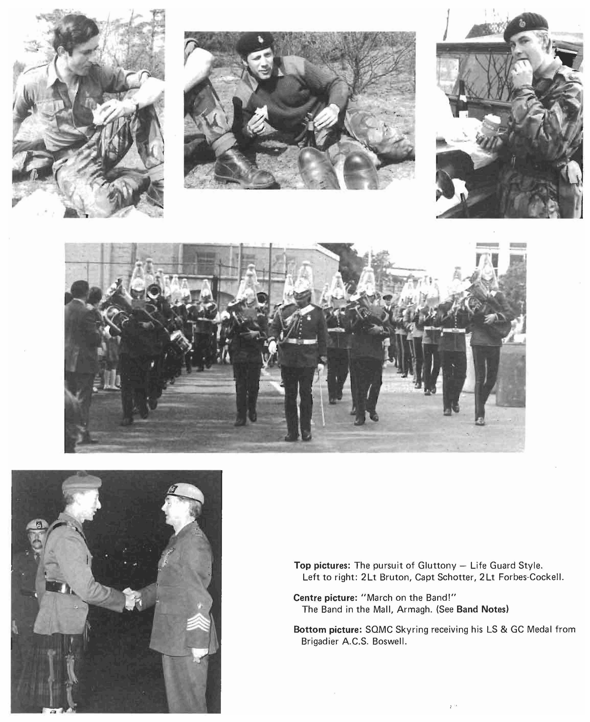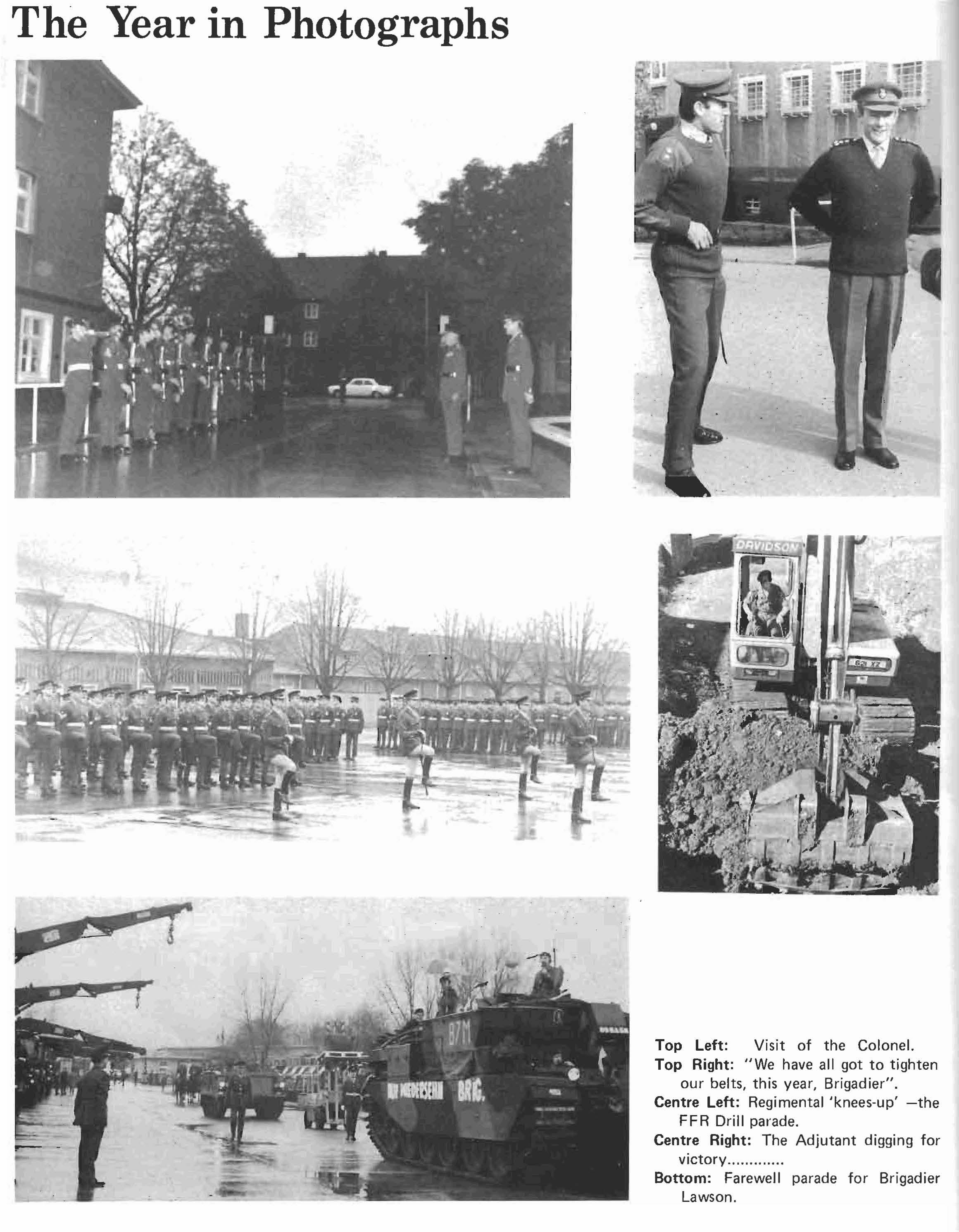 To end the year we spent a week relearning the problems of our tanks at Soltau and then almost immediately faced our annual Fitness for Role Inspection by our Divisional Commander. This year's inspection was along the I ines of the old administrative inspection and opened with the Regiment drawn up on the square. General Gow, late Scots Guards, then took the salute as we marched past in slow and quick time and finally advanced in review order. We were played past by The Pipes and Drums of the 1st Battalion Scots Guards wh ich made the whole parade very much a family affair.