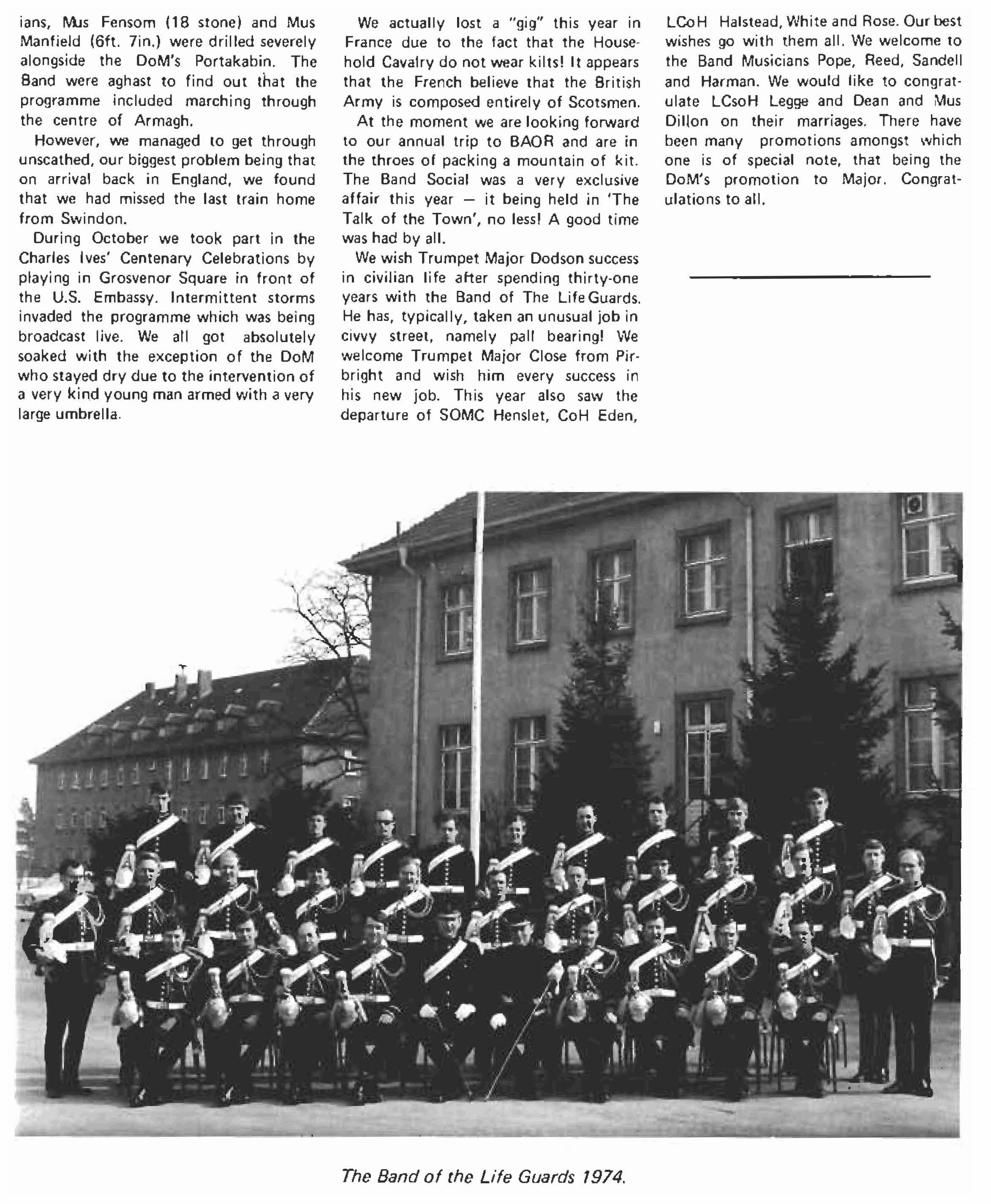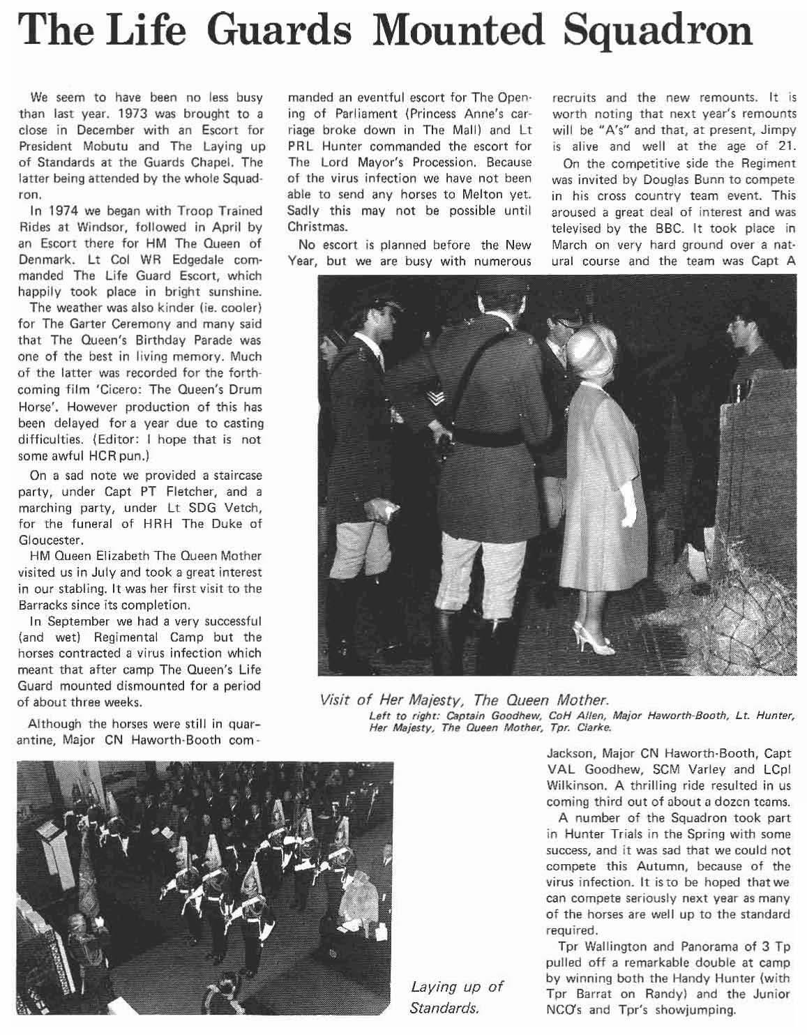 In 1974 we began with Troop Trained Aides at Windsor, followed in April by an Escort there for HM The Queen of Denmark. Lt Col WR Edgedale com· manded The life Guard Escort, which happily took place in bright sunshine.
