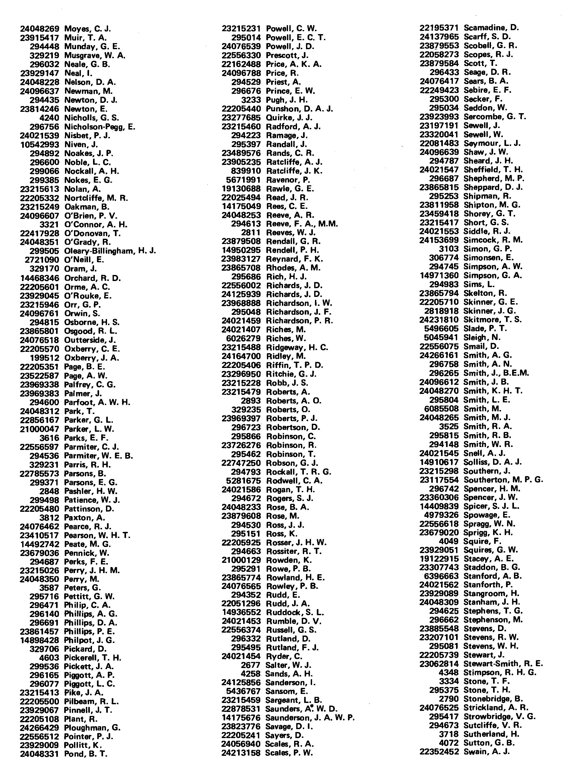 23215231 Powell, C. W. 295014 Powell, E. C. T. 24076539 Powell, J. D. 22556330 Prescott, J. 22162488 Price, A. K. A. 24096788 Price, R. 294529 Priest, A. 296676 Prince, E. W. 3233 Pugh, J. H. 22205440 Punshon, D. A. J. 23277685 Quirke, J. J. 23215460 Radford, A. J. 294223 Ramage, J. 295397 Randall, J. 23489576 Rands, C. R. 23905235 RatCliffe, A. J. 839910 Ratcliffe, J. K. 5671991 Ravenor, P. 19130688 Rawle, G. E. 22025494 Read, J. R. 14175049 Rees, C. E. 24048253 Reeve, A. R. 294613 Reeve, F. A., M.M. 2811 Reeves, W. J. 23879508 Rendall, G. R. 14950295 Rendell, P. H. 23983127 Reynard, F. K. 23865708 Rhodes, A. M. 295686 Rich, H. J. 22556002 Richards, J. D. 24125939 Richards, J. D. 23968888 Richardson, I. W. 295048 Richardson, J. F. 24021459 Richardson, P. R. 24021407 Riches, M. 6026279 Riches, W. 23215488 Ridgeway, H. C. 24164700 Ridley, M. 22205406 Riffin, T. P. D. 23296950 Ritchie, G. J. 23215228 Robb, J. S. 23215479 2893 Roberts, A. O. 329235 Roberts, O. 23969397 Roberts, P. J. 296723 Robertson, D. 295866 Robinson, C. 23726276 Robinson, R. 295462 Robinson, T. 22747250 Robson, G. J. 294793 Rockall, T. R. G. 5281675 Rodwell, C. A. 24021586 Rogan, T. H. 294672 Rogers, S. J. 24048233 Rose, B. A. 23879608 Rose, M. 294530 Ross, J. J. 295151 Ross, K. 22205925 Rosser, J. H. W. 294663 Rossiter, R. T. 21000129 Rowden, K. 295291 Rowe, P. B. 23865774 Rowland, H. E. 24076565 Rowley, P. B. 294352 Rudd, E. 22051296 RUdd,J.A. 14936552 Ruddock, S. L. 24021453 Rumble, D. V. 22556374 Russell, G. S. 296332 Rutland, D. 295495 Rutland, F. J. 24021454 Ryder, C. 2677 Salter, W. J. 4258 Sands, A. H. 24125856 Sanderson, I. 5436767 Sansom, E. 23215459 Sargeant, L. B. 22878531 Saunders, W. D. 14175676 Saunderson, J. A. W. P. 23823776 Savage, D. I. 22205241 Sayers, D. 24056940 Scales, R. A. 24213158 Scales, P. W.