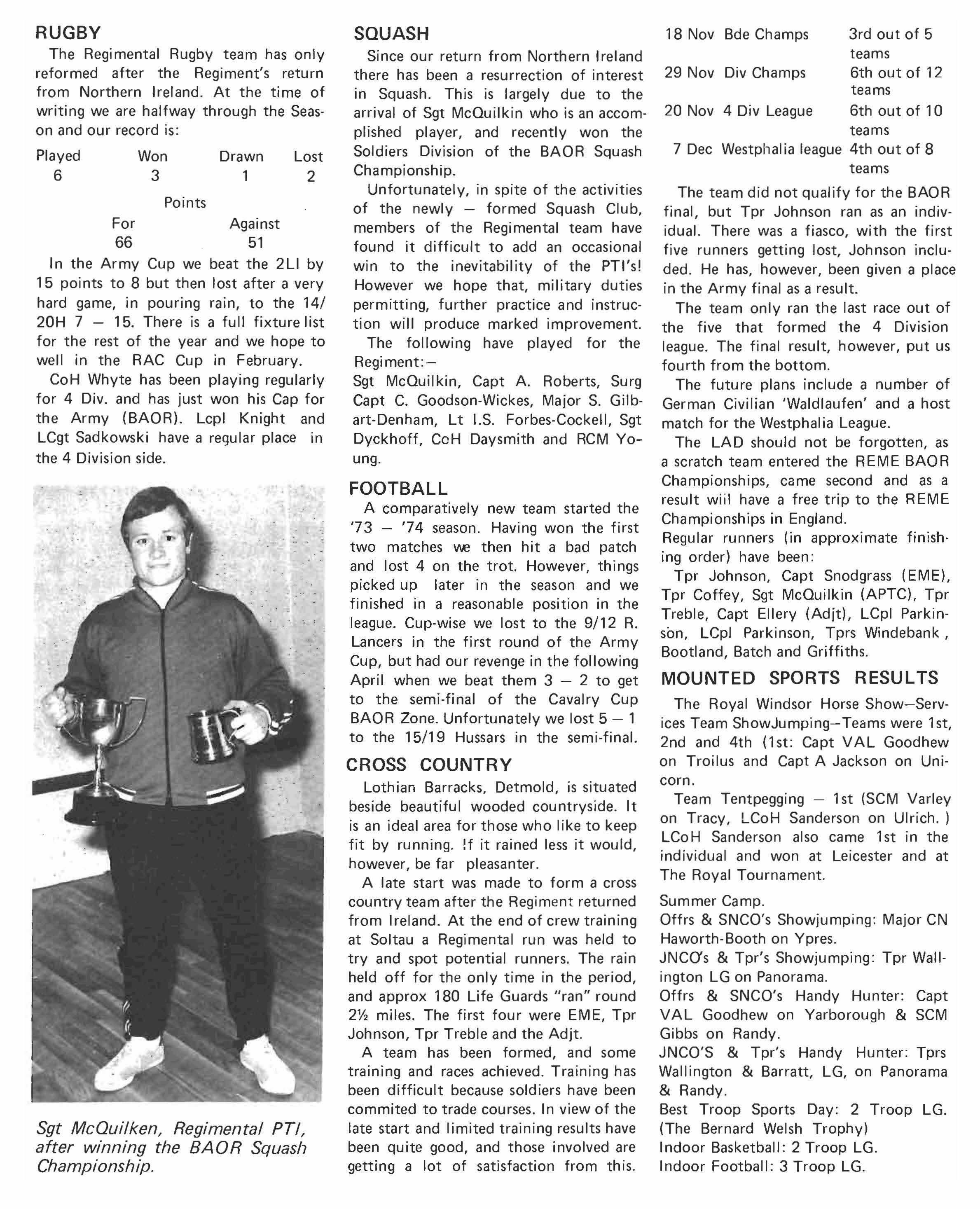 The Rememberance Day Parade signalled the end of what might be termed the Regiment's outdoor activities until January. In the meanti me an extensive number of courses were run within barracks, including an NCO'S Cadre Course, a CVR (Scorpion) Commanders Coursesign that we are soon returning to Windsor - and numerous other Chief ton trades. In addition Regimental sport has been taken up again after a lapse of some years and this year the Regiment has fielded teams in just about every concievable sport. CoH Whyte, stables NCO, was selected for the Army Rugby XV.