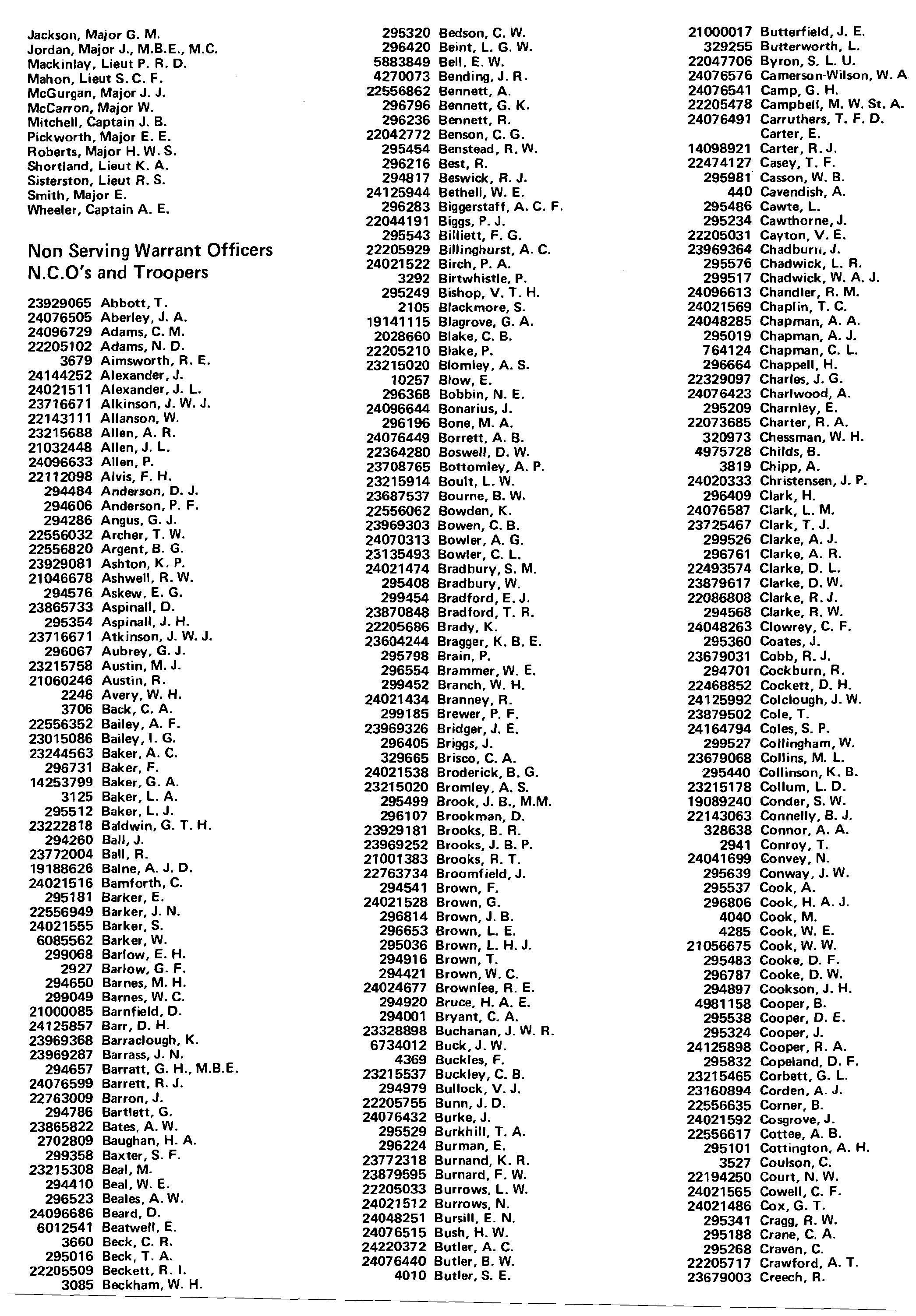23929065 Abbott, T. 24076505 Aberley, J. A. 24096729 Adams, e. M. 22205102 Adams, N. D. 3679 Aimsworth, R. E. 24144252 Alexander, J. 24021511 Alexander, J. L. 23716671 Alkinson, J. W. J. 22143111 Allanson, W. 23215688 Allen. A. R. 21032448 Allen, J. L. 24096633 Allen, P. 22112098 Alvis, F. H. 294484 Anderson, D. J. 294606 Anderson, P. F. 294286 Angus, G. J. 22556032 Archer, T. W. 22556820 Argent, B. G. 23929081 Ashton, K. P. 21046678 Ashwell, R. W. 294576 Askew. E. G. 23865733 Aspinall, D. 295354 Aspinall, J. H. 23716671 Atkinson, J. W. J. 296067 Aubrey, G. J. 23215758 Austin, M. J. 21060246 Austin, R. 2246 Avery, W. H. 3706 Back, C. A. 22556352 Bailey, A. F. 23015086 Bailey, I. G. 23244563 Baker, A. e. 296731 Baker, F. 14253799 Baker. G. A. 3125 Baker, L. A. 295512 Baker, L. J. 23222818 Baldwin, G. T. H. 294260 Ball, J. 23772004 Ball, R. 19188626 Baine, A. J. D. 24021516 Bamforth, C. 295181 Barker, E. 22556949 Barker, J. N. 24021555 Barker, S. 6085562 Barker, W. 299068 Barlow, E. H. 2927 Barlow, G. F. 294650 Barnes, M. H. 299049 Barnes, W. C. 21000085 Barnfield, D. 24125857 Barr, D. H. 23969368 Barraclough, K. 23969287 Barrass, J. N. 294657 Barratt, G. H., M.B.E. 24076599 Barrett, R. J. 22763009 Barron, J. 294786 Bartlett, G. 23865822 Bates. A. W. 2702809 Baughan, H. A. 299358 Baxter, S. F. 23215308 Beal, M. 294410 Beal. W. E. 296523 Beales, A. W. 24096686 Beard, D. 6012541 Beatwell, E. 3660 Beck, C. R. 295016 Beck, T. A. 22205509 Beckett, R. I. 3085 Beckham. W. H.