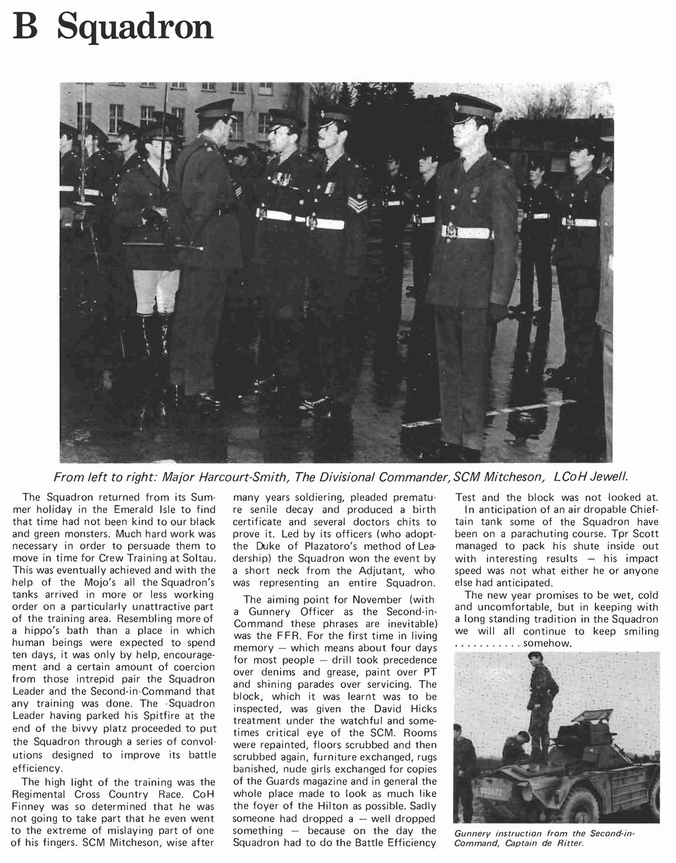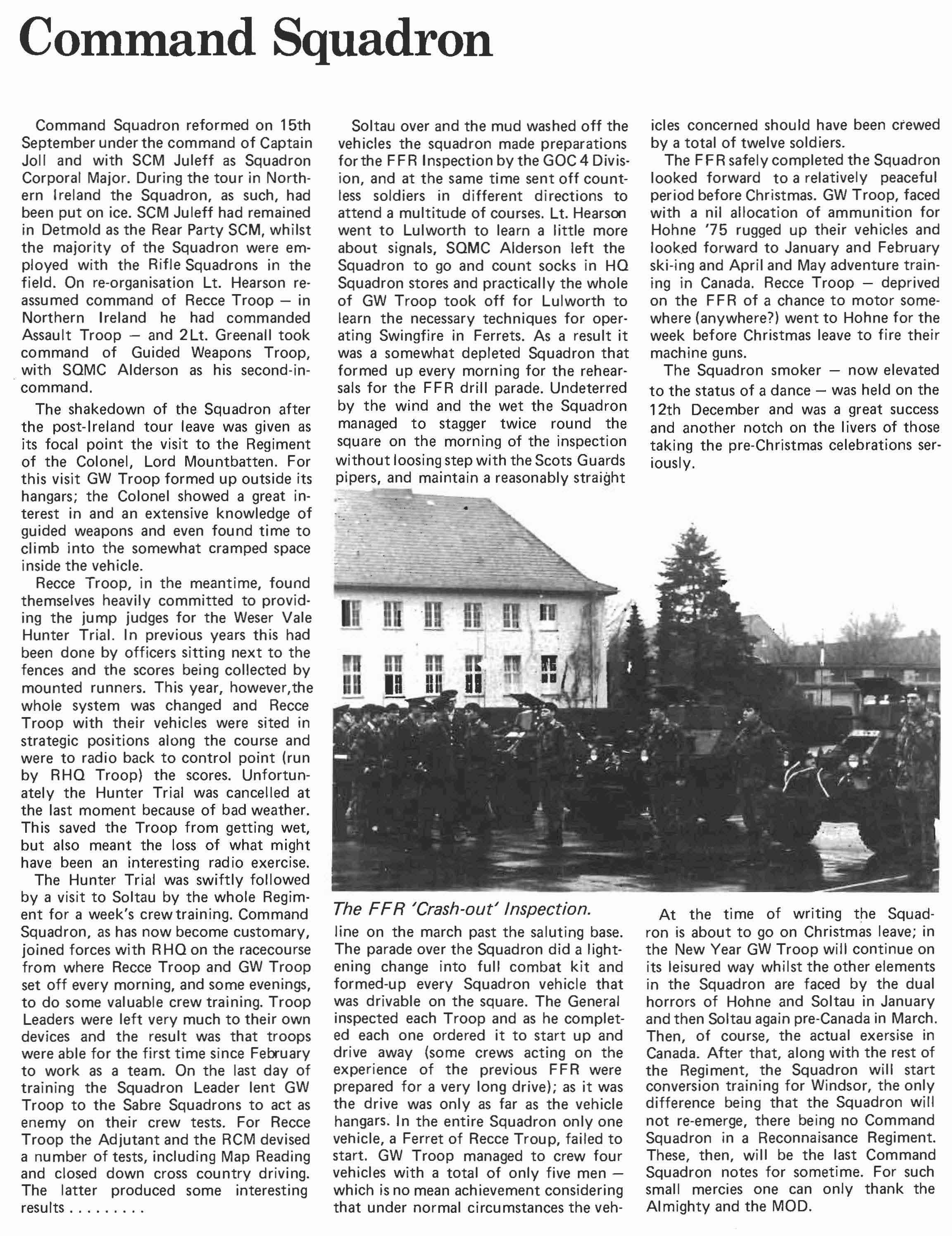 At the time of writing the Squadron is about to go on Christmas leave; in the New Year GW Troop will continue on its leisured way whilst the other elements in the Squadron are faced by the dual horrors of Hohne and Soltau in January and then Soltau again pre-Canada in March. Then, of course, the actual exersise in Canada. After that, along with the rest of the Regiment, the Squadron will start conversion training for Windsor, the only difference being that the Squadron will not re-emerge, there being no Command Squadron in a Reconnaisance Regiment. These, then, will be the last Command Squadron notes for sometime. For such small mercies one can only thank the Almighty and the MOD.