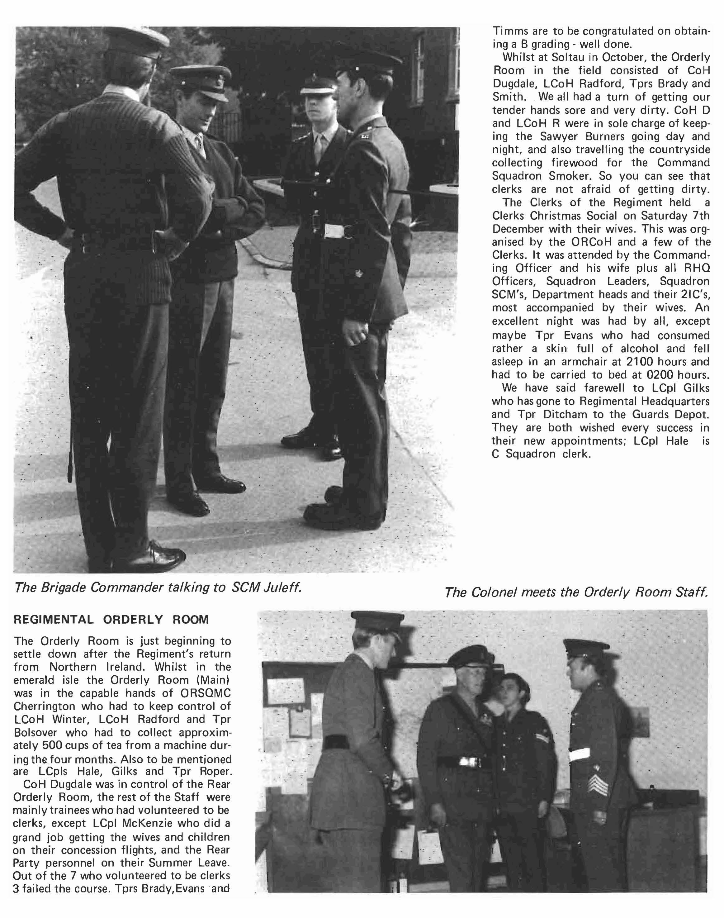 The Orderly Room is just beginning to settle down after the Regiment's return from Northern Ireland. Whilst in the emerald isle the Orderly Room (Main) was in the capable hands of ORSOMC Cherrington who had to keep control of LCoH Winter, LCoH Radford and Tpr Bolsover who had to collect approximately 500 cups of tea from a machine during four months. Also to be mentjoned are LCpls Hale, Gilks and Tpr Roper. CoH Dugdale was in control of the Rear Orderly Room, the rest of the Staff were mainly trainees who had volunteered to be clerks, except LCpl McKenzie who did a grand job getting the wives and children on their concession flights, and the Rear Party personnel on their Summer Leave. Out of the 7 who volunteered to be clerks 3 failed the course. Tprs BradY,Evans -and