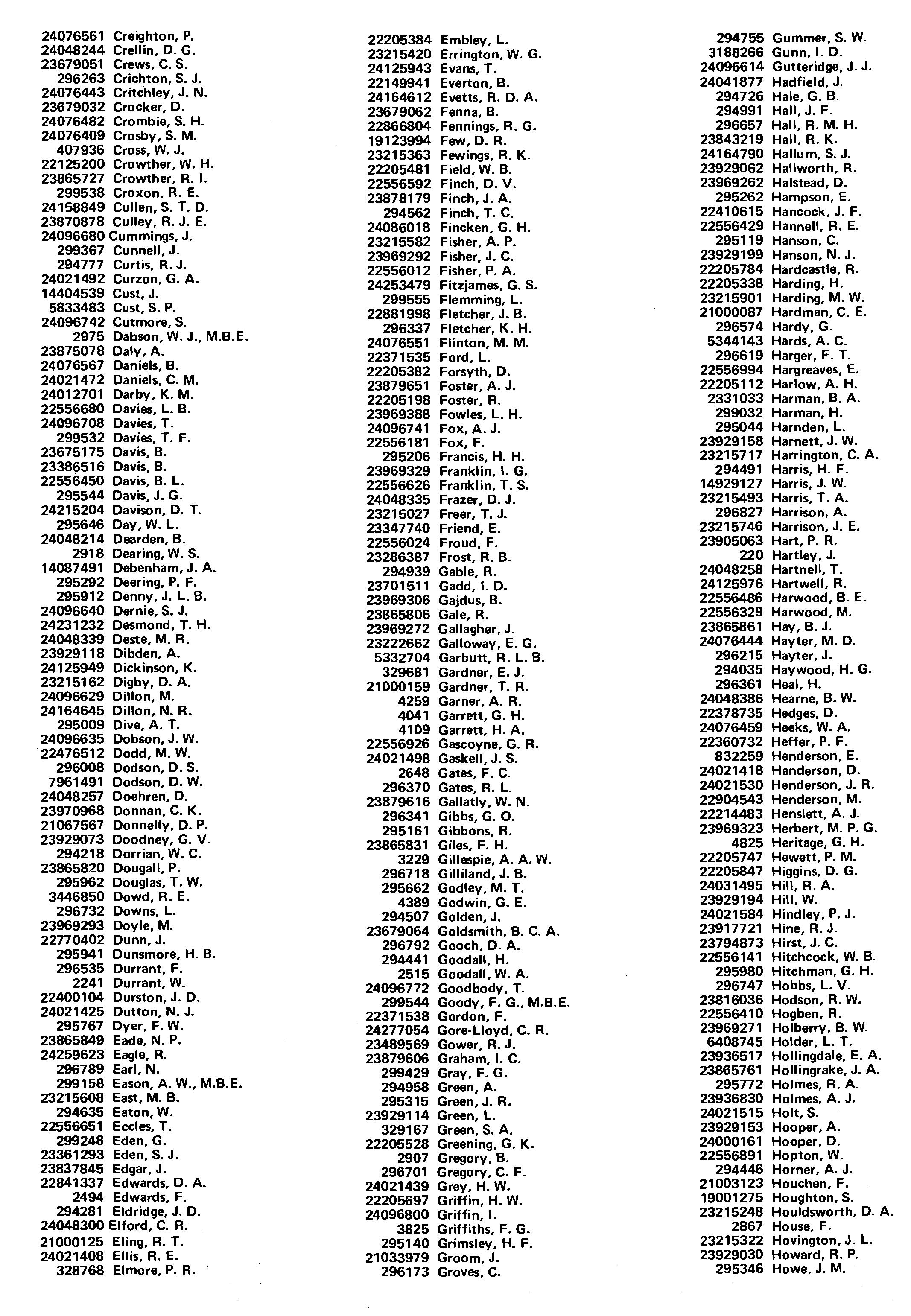 22205384 Embley, L. 23215420 Errington, W. G. 24125943 Evans, T. 22149941 Everton,B. 24164612 Evetts, R. D. A. 23679062 Fenna, B. 22866804 Fennings, R. G. 19123994 Few,D. R. 23215363 Fewings, R. K. 22205481 Field, W. B. 22556592 Finch, D. V. 23878179 Finch, J. A. 294562 Finch, T. C. 24086018 Fincken, G. H. 23215582 Fisher, A. P. 23969292 Fisher, J. C. 22556012 Fisher, P. A. 24253479 Fitzjames, G. S. 299555 Flemming, L. 22881998 Fletcher, J. B. 296337 Fletcher, K. H. 24076551 Flinton, M.M. 22371535 Ford, L. 22205382 Forsyth, D. 23879651 Foster, A. J. 22205198 Foster, R. 23969388 Fowles, L. H. 24096741 Fox, A. J. 22556181 Fox, F. 295206 Francis, H. H. 23969329 Franklin, I. G. 22556626 Franklin, T. S. 24048335 Frazer, D. J. 23215027 Freer, T. J. 23347740 Friend, E. 22556024 FrOUd, F. 23286387 Frost, R. B. 294939 Gable, R. 23701511 Gadd, I. D. 23969306 Gajdus. B. 23865806 Gale, R. 23969272 Gallagher. J. 23222662 Galloway. E. G. 5332704 Garbutt. R. L. B. 329681 Gardner, E. J. 21000159 Gardner. T. R. 4259 Garner. A. R. 4041 Garrett, G. H. 4109 Garrett. H. A. 22556926 Gascoyne, G. R. 24021498 Gaskell, J. S. 2648 Gates, F. C. 296370 Gates, R. L. 23879616 Gal/atly, W. N. 296341 Gibbs, G. O. 295161 Gibbons, R. 23865831 Giles, F. H. 3229 Gillespie, A.A. W. 296718 Gilliland, J. B. 295662 Godley, M. T. 4389 Godwin. G. E. 294507 Golden, J. 23679064 Goldsmith, B. C. A. 296792 Gooch,D.A. 294441 Goodall, H. 2515 Goodall, W. A. 24096772 Goodbody, T. 299544 Goody, F. G., M.B.E. 22371538 Gordon, F. 24277054 Gore-Lloyd, C. R. 23489569 Gower, R. J. 23879606 Graham, I. C. 299429 Gray, F. G. 294958 Green, A. 295315 Green, J. R. 23929114 Green, L. 329167 Green, S. A. 22205528 Greening, G. K. 2907 Gregory, B. 296701 Gregory, C. F. 24021439 Grey, H. W. 22205697 Griffin, H. W. 24096800 Griffin, I. 3825 Griffiths, F. G. 295140 Grimsley, H. F. 21033979 Groom, J. 296173 Groves. C.