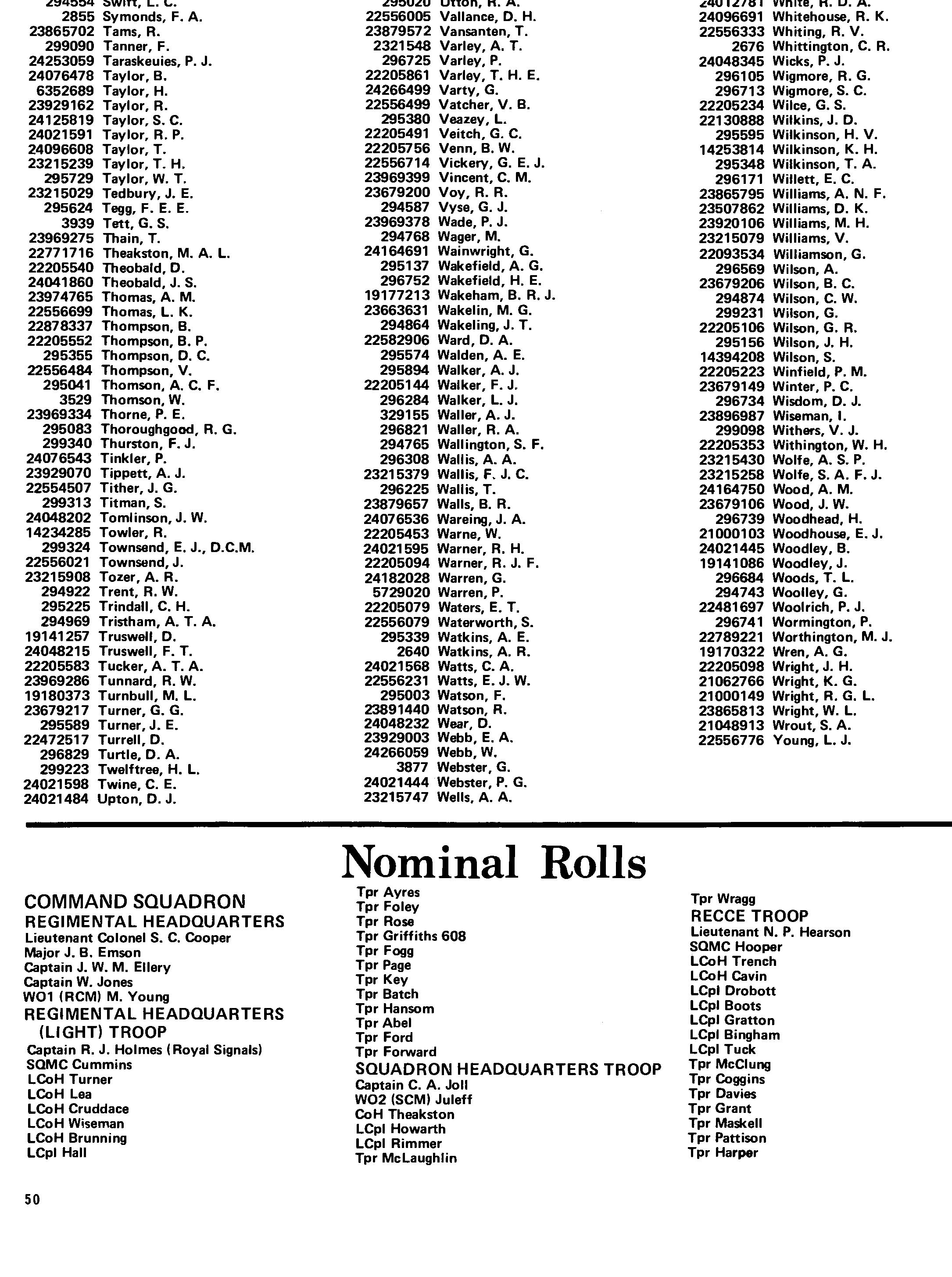 2855 Symonds, F. A. 23865702 Tams, R. 299090 Tanner, F. 24253059 Taraskeuies, P. J. 24076478 Taylor, B. 6352689 Taylor, H. 23929162 Taylor, R. 24125819 Taylor, S. C. 24021591 Taylor, R. P. 24096608 Taylor, T. 23215239 Taylor, T. H. 295729 Taylor, W. T. 23215029 Tedbury, J. E. 295624 Tegg, F. E.E. 3939 Tett, G. S. 23969275 Thain, T. 22771716 Theakston, M. A. L. 22205540 Theobald, D. 24041860 Theobald, J. S. 23974765 Thomas. A. M. 22556699 Thomas, L. K. 22878337 Thompson, B. 22205552 Thompson. B. P. 295355 Thompson, D. C. 22556484 Thompson. V. 295041 Thomson, A. C. F. 3529 Thomson, W. 23969334 Thorne, P. E. 295083 Thoroughgood, R. G. 299340 Thurston, F. J. 24076543 Tinkler. P. 23929070 Tippett. A. J. 22554507 Tither. J. G. 299313 Titman. S. 24048202 Tomlinson. J. W. 14234285 Towler. R. 299324 Townsend. E. J .• D.C.M. 22556021 Townsend. J. 23215908 Tozer, A. R. 294922 Trent, R. W. 295225 Trindall, C. H. 294969 Tristham. A. T. A. 19141257 Truswell, D. 24048215 Truswell. F. T. 22205583 Tucker. A. T. A. 23969286 Tunnard, R. W. 19180373 Turnbull. M. L. 23679217 Turner. G. G. 295589 Turner. J. E. 22472517 Turrell. D. 296829 Turtle. D. A. 299223 Twelftree, H. L. 24021598 Twine, C. E. 24021484 Upton, D. J.