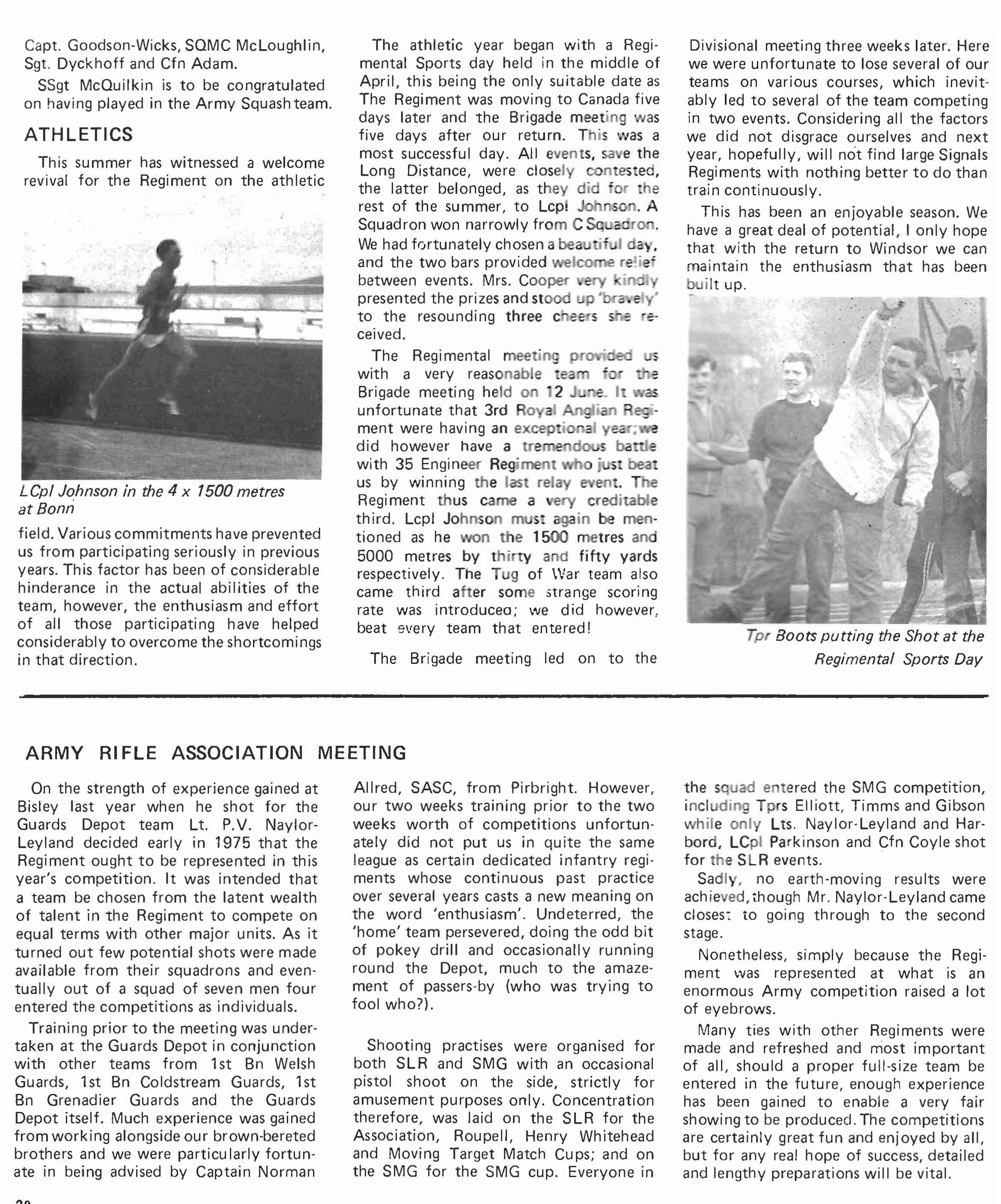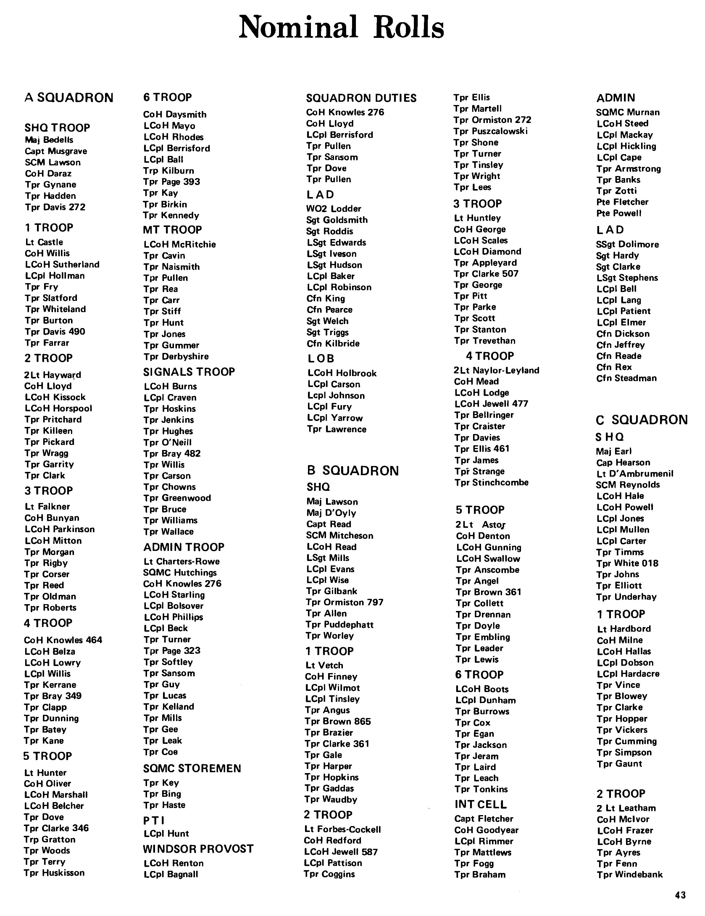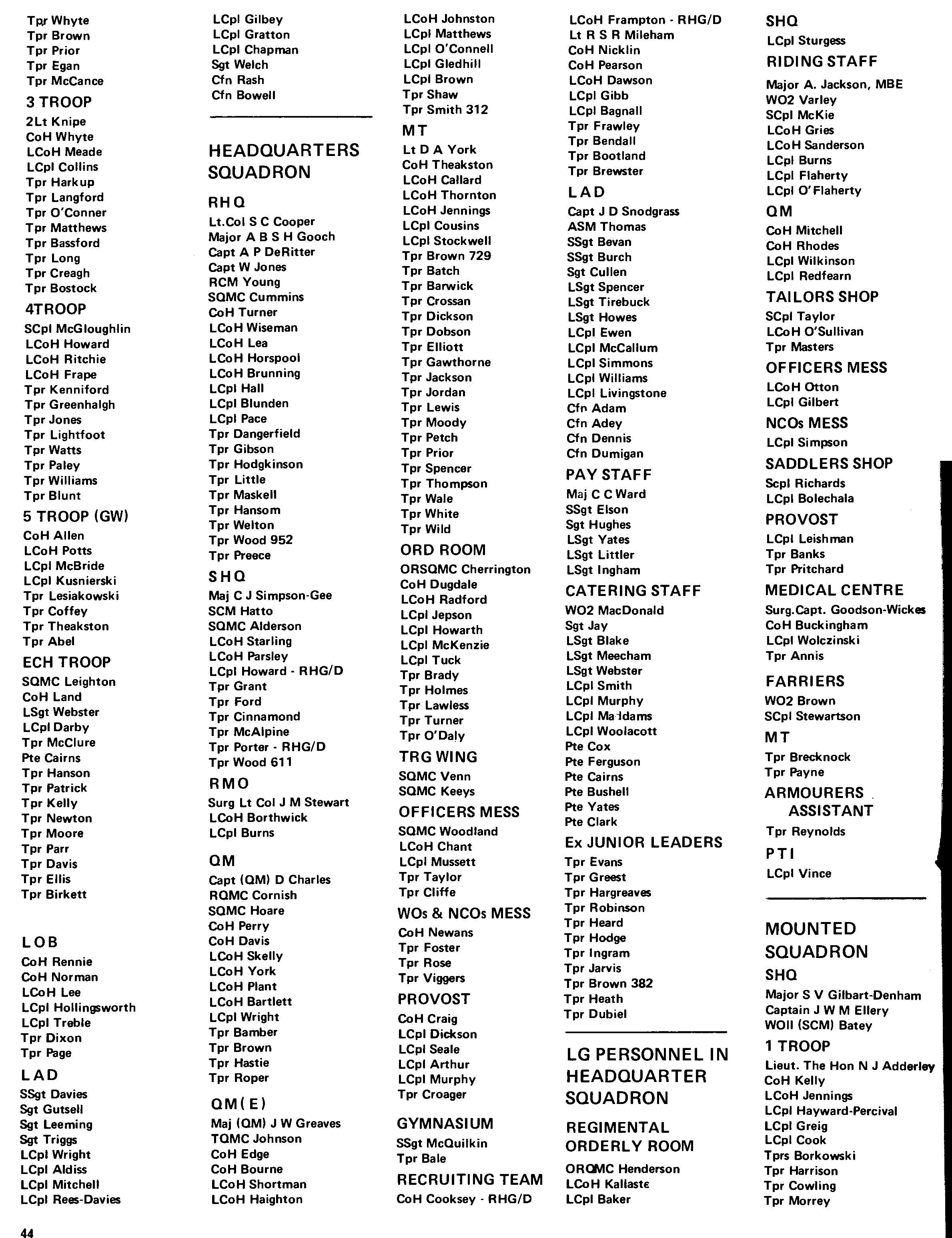 Tpr Lawless is to be congratulated on attaining aB pass on his B3 after only 2% weeks. LCoH Hale also deserves congratulations on his recent promotion as does Lcpl Bolsover, the latter having left us to become A Squadron clerk, replacing Lcpl Whetman who has transferred to the RMP. We have said farewell to LCoH Winter who has gone to try the patience of the Superintending Clerk at the Guards Depot, also to Tpr Evans who has gone to B Squadron to replace Lcpl Jepson who has returned to the fold.