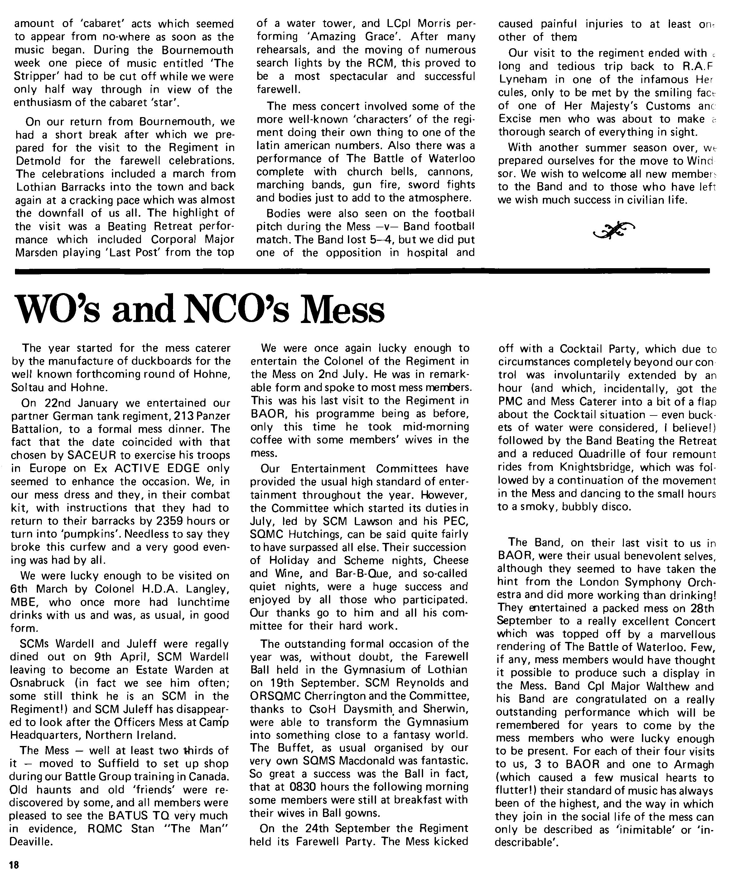 We have held two very successful discotheques and managed to attract far more 'talent' than usual. Apart from this, there have been several 'Happy Hours', notably to send off Squadron Corporal Major Wardell, who left in February to take charge of a married families patch in Osnabruck. We will miss that penetrating voice and his great devoti on to the Squadron. To get back to 'Happy Hours', some members of the Squadron have expressed dissatisfaction at the lack of home-made entertainment at these affairs. The loudest complaints come from surviving members of the now-defunct, but once dreaded, 'Committee' who saw to it that everybody got a fair chance to sing. What is it about an innocent chorus of 'We call upon so & so to sing us a song etc. etc'. that makes most officers wish they could curl up and die? I can confidently predict that the NAAFI at Windsor will soon be seething with an old fashioned Squadron 'Smoker'.