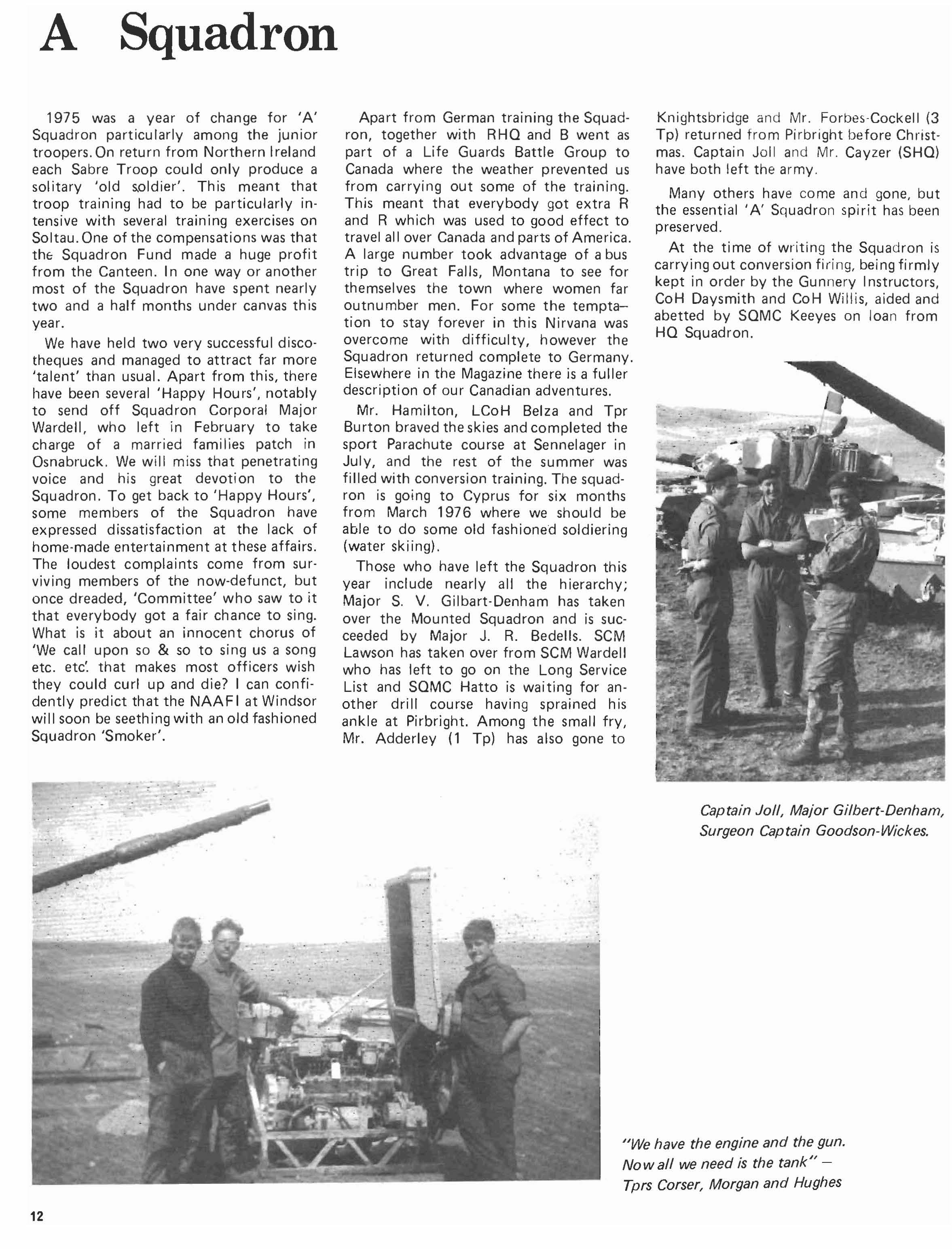1975 was a year of change for 'A' Squadron particularly among the junior troopers. On return from Northern Ireland each Sabre Troop could only produce a solitary 'old s.oldier'. This meant that troop training had to be particularly intensive with several training exercises on Soltau. One of the compensations was that thE; Squadron Fund made a huge profit from the Canteen. In one way or another most of the Squadron have spent nearly two and a half months under canvas th is year.