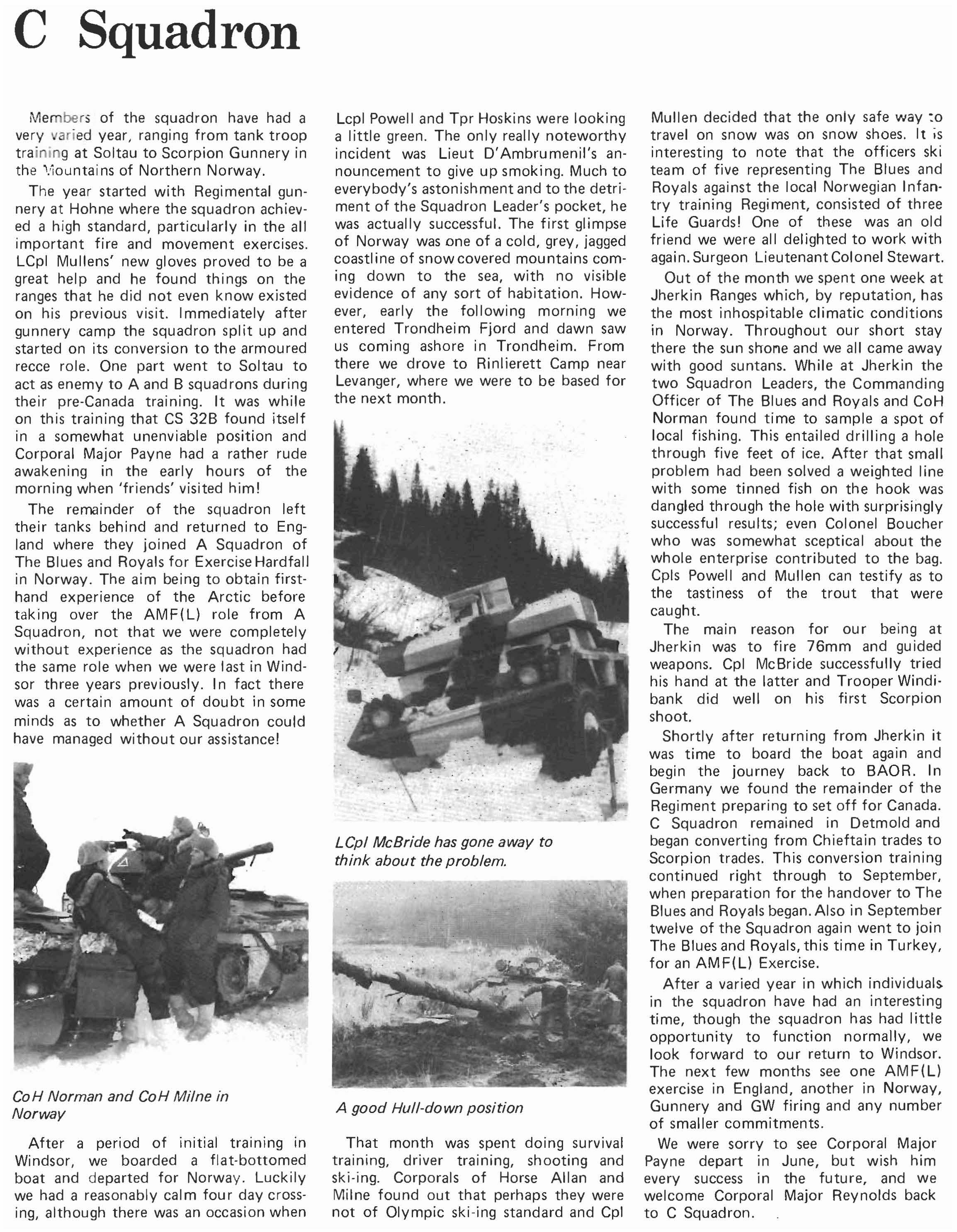 Member; of the squadron have had a very aried year, ranging from tank troop training at Soltau to Scorpion Gunnery in the ns of Northern Norway.