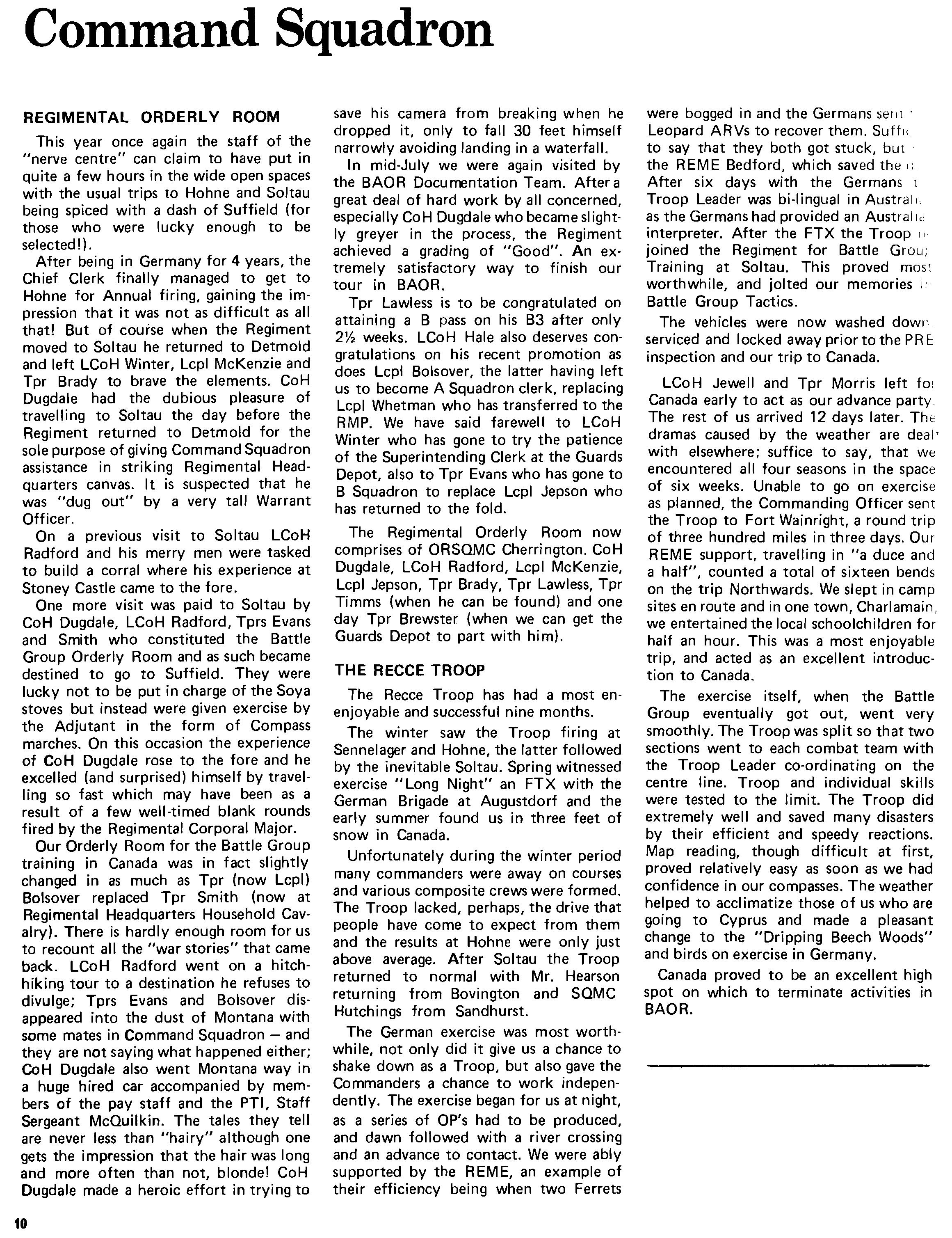 One more visitwas paid to Soltau by CoH Dugdale, LCoH Radford, Tprs Evans and Smith who constituted the Battle Group Orderly Room and as such became destined to go to Suffield. They were lucky not to be put in charge of the Soya stoves but instead were given exercise by the Adjutant in the form of Compass marches. On this occasion the experience of CoH Dugdale rose to the fore and he excelled (and surprised) himself by travelling so fast which may have been as a result of a few well-timed blank rounds fired by the Regimental Corporal Major. Our Orderly Room for the Battle Group training in Canada was in fact slightly changed in as much as Tpr (now Lcpl) Bolsover replaced Tpr Smith (now at Regimental Headquarters Household Cavalry). There is hardly enough room for us to recount all the "war stories" that came back. LCoH Radford went on a hitchhiking tour to a destination he refuses to divulge; Tprs Evans and Bolsover disappeared into the dust of Montana with some mates in Command Squadron - and they are not saying what happened either; CoH Dugdale also went Montana way in a huge hired car accompanied by members of the pay staff and the PTI, Staff Sergeant McQuilkin. The tales they tell are never less than "hairy" although one gets the impression that the hair was long and more often than not, blonde! CoH Dugdale made a heroic effort in trying to