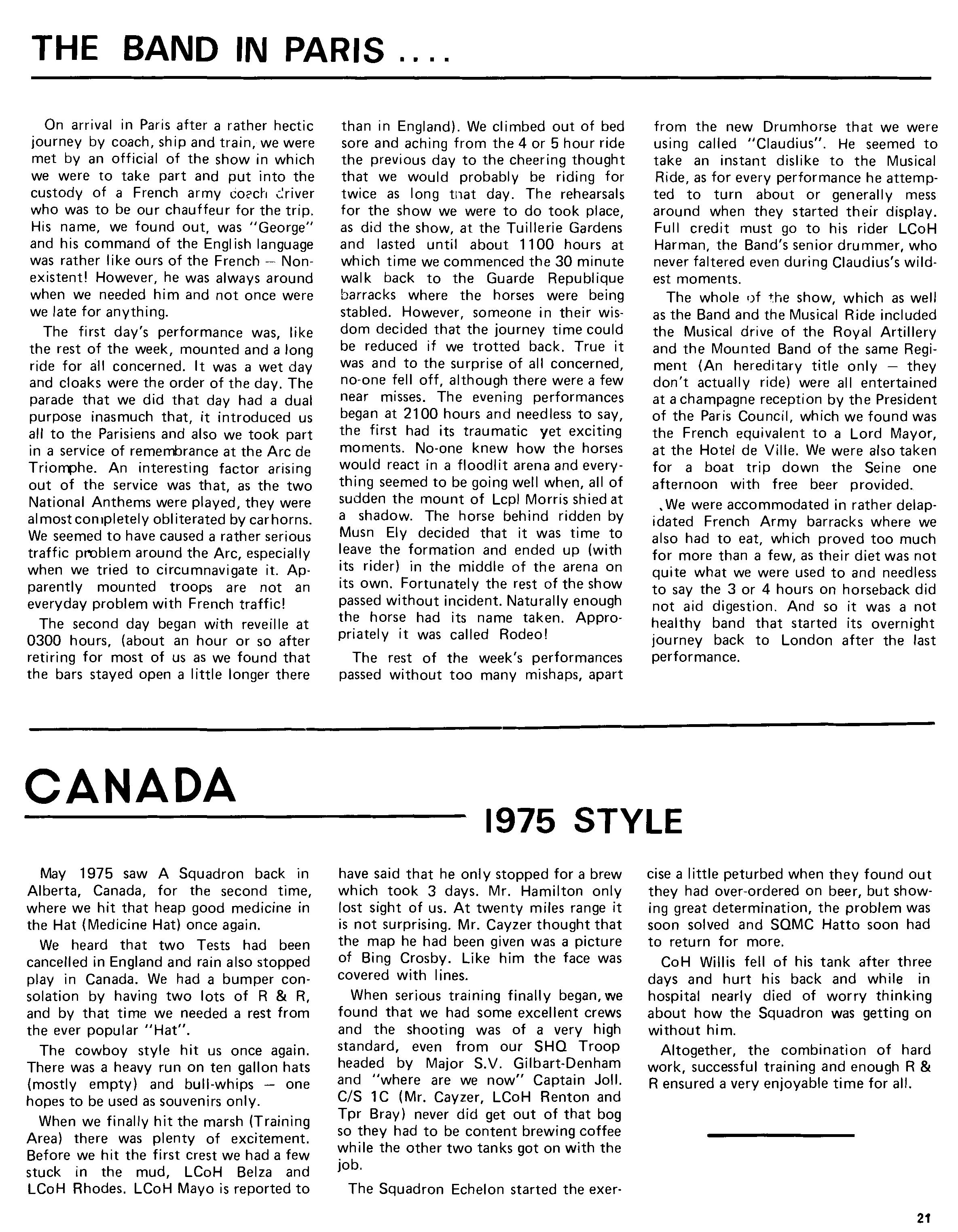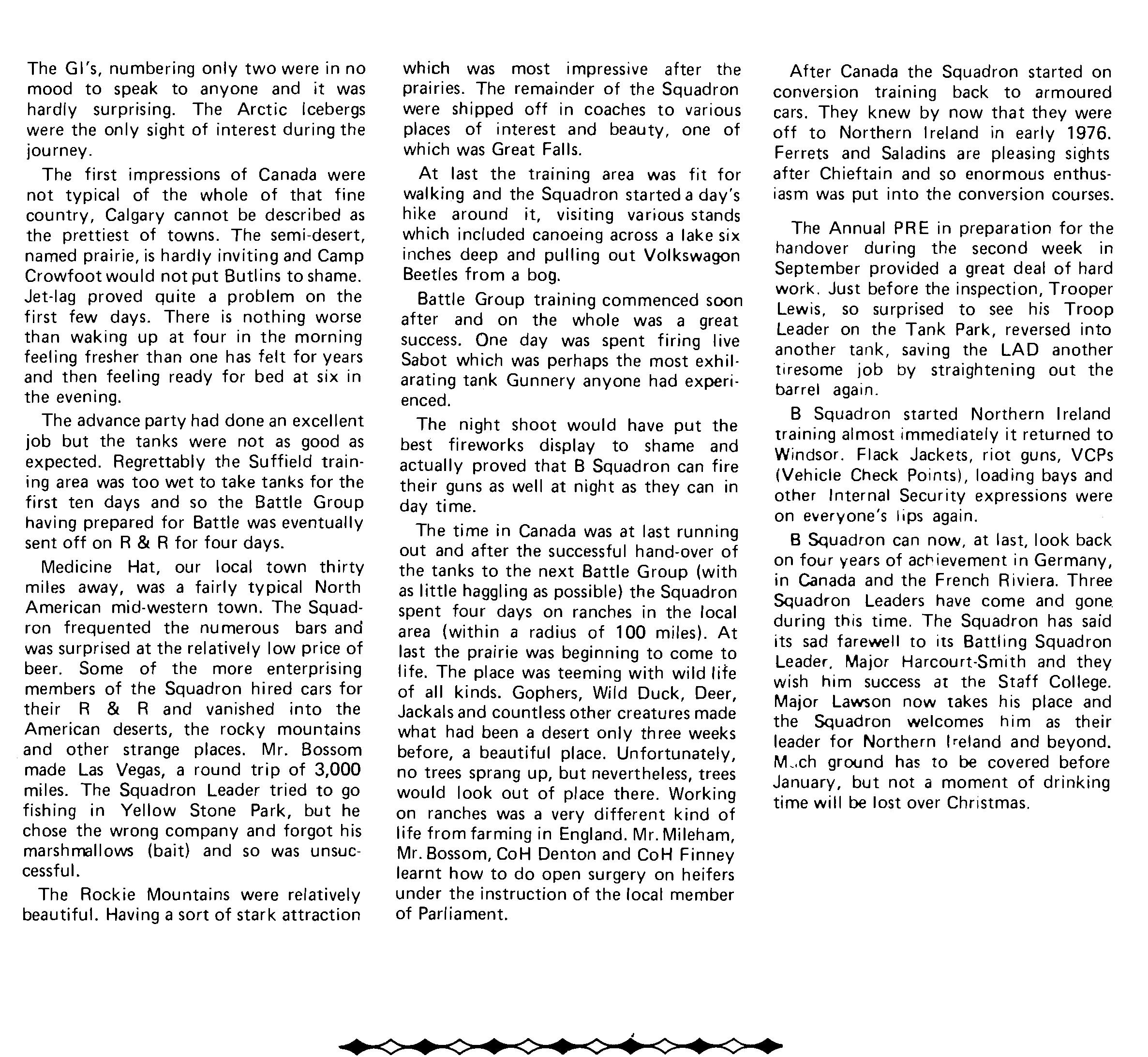 Apart from German training the Squadron, together with RHO and B went as part of a Life Guards Battle Group to Canada where the weather prevented us from carrying out some of the training. This meant that everybody got extra R and R which was used to good effect to travel all over Canada and parts of America. A large number took advantage of a bus trip to Great Falls, Montana to see for themselves the town where women far outnumber men. For some the temptation to stay forever in this Nirvana was overcome with difficulty, however the Squadron returned complete to Germany. Elsewhere in the Magazine there is a fuller description of our Canadian adventures.