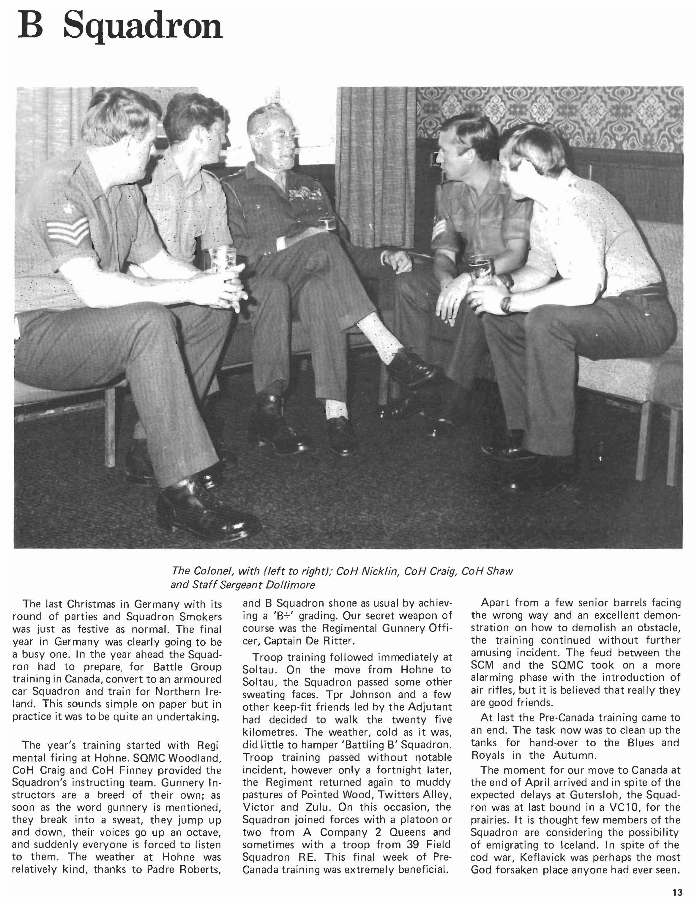 The last Christmas in Germany with its round of parties and Squadron Smokers was just as festive as normal. The final year in Germany was clearly going to be a busy one. In the year ahead the Squadron had to prepare, for Battle Group training in Canada, convert to an armoured car Squadron and train for Northern Ireland. This sounds simple on paper but in practice it was to be quite an undertaking.
