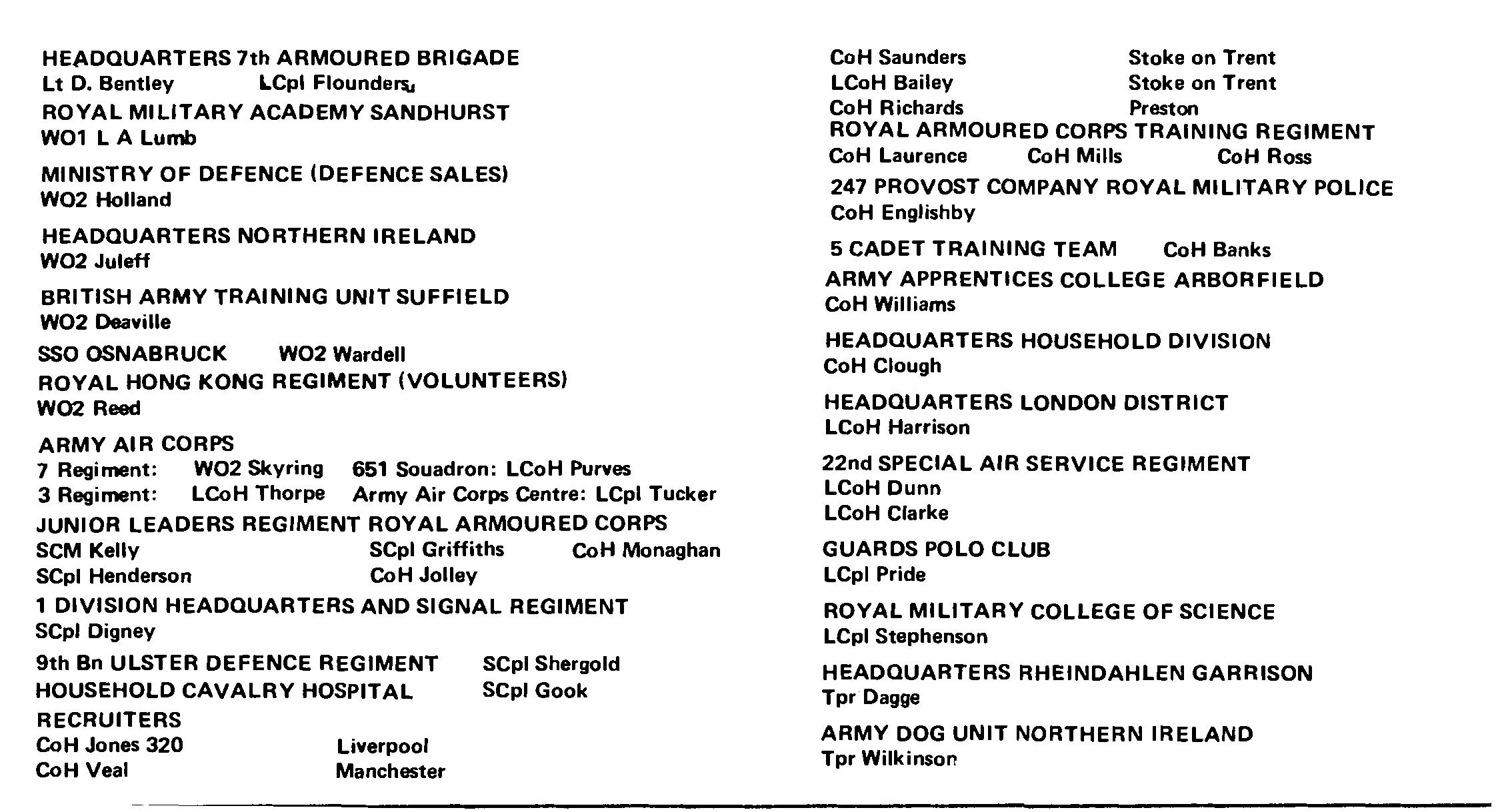 Unfortunately during the winter period many commanders were away on courses and various composite crews were formed. The Troop lacked, perhaps, the drive that people have come to expect from them and the results at Hohne were only just above average. After Soltau the Troop returned to normal with Mr. Hearson returning from Bovington and SQMC Hutchings from Sandhurst.