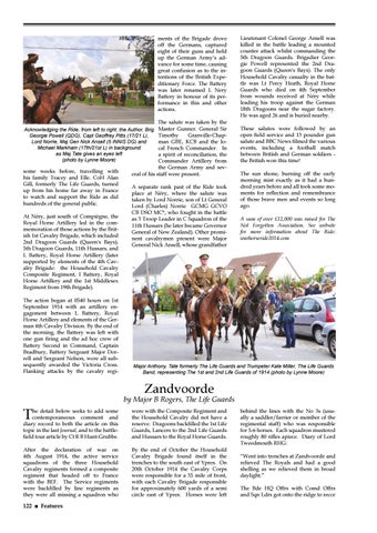 some weeks before, travelling with his family Tracey and Elle. CoH Alan Gill, formerly The Life Guards, turned up from his home far away in France to watch and support the Ride as did hundreds of the general public. At Néry, just south of Compiègne, the Royal Horse Artillery led in the commemoration of those actions by the British 1st Cavalry Brigade, which included 2nd Dragoon Guards (Queen's Bays), 5th Dragoon Guards, 11th Hussars, and L Battery, Royal Horse Artillery (later supported by elements of the 4th Cavalry Brigade: the Household Cavalry Composite Regiment, I Battery, Royal Horse Artillery and the 1st Middlesex Regiment from 19th Brigade). The action began at 0540 hours on 1st September 1914 with an artillery engagement between L Battery, Royal Horse Artillery and elements of the German 4th Cavalry Division. By the end of the morning, the Battery was left with one gun firing and the ad hoc crew of Battery Second in Command, Captain Bradbury, Battery Sergeant Major Dorrell and Sergeant Nelson, were all subsequently awarded the Victoria Cross. Flanking attacks by the cavalry regi-