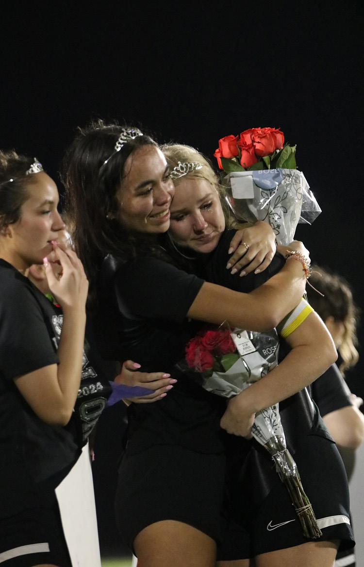 Seniors Corinne Schear and Keira Logan hug each other on Soccer senior night. Photo by K. McGoldrick