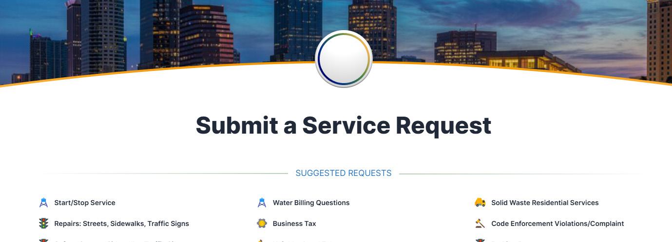 The main page of the website includes categories of service requests. There are many suggested requests and a section with broad topics that, when clicked, bring up subtopics. There is also a search bar that can find a request.