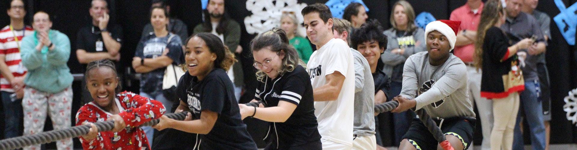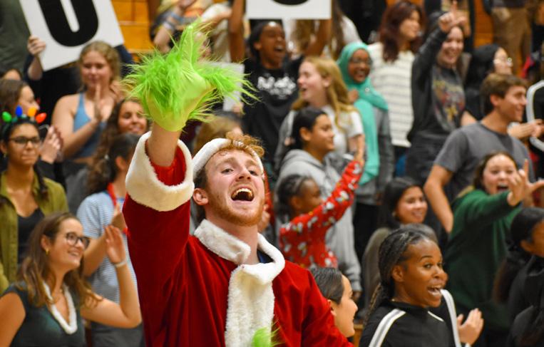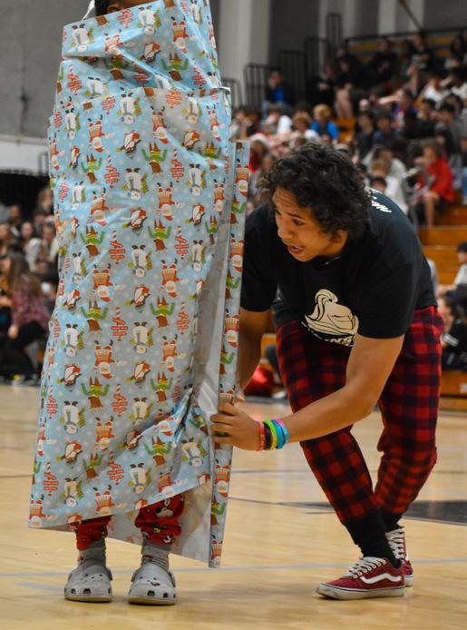 The Pep Rally included a few familiar games, with a bit of a holiday twist on them. Following the winter sports teams’ musical entry, a series of games went forth to involve members from the audience. There was a gift-wrapping race, during which partners hurried to wrap each other up in wrapping paper, tug-of-war with captains of the