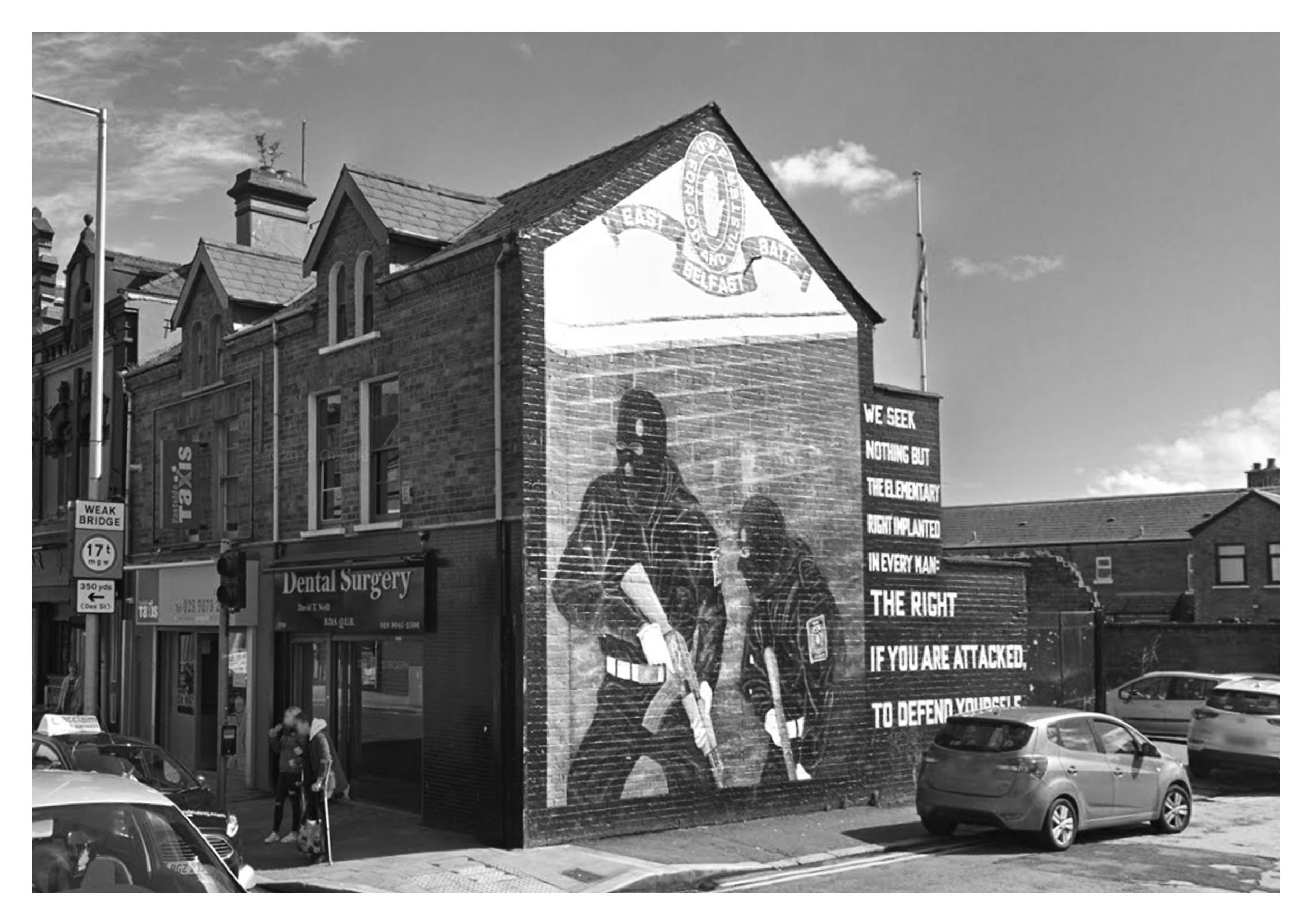 When this literature is applied to the ongoing situation within Belfast it allows the murals to be interpreted as ‘Architecture of Communication’ instead of art on the side of a wall. In the same manner that the motel’s sign quickly allows you to become aware of its existence, these murals signify that you are entering a Loyalist territory with a paramilitary presence. In addition, these murals are subject to the same form of roadside eclecticism as they are predominantly located on gable walls which increases their visual presence within the area. This section continues to say that all cities communicate messages that can be functional, symbolic, and persuasive to people as they move through a space. However, when this is put into the context of East Belfast the main message portrayed is that the area still holds a strong Loyalist ideology which further solidifies subjective. opinions and can be intimidating to someone with a different background.