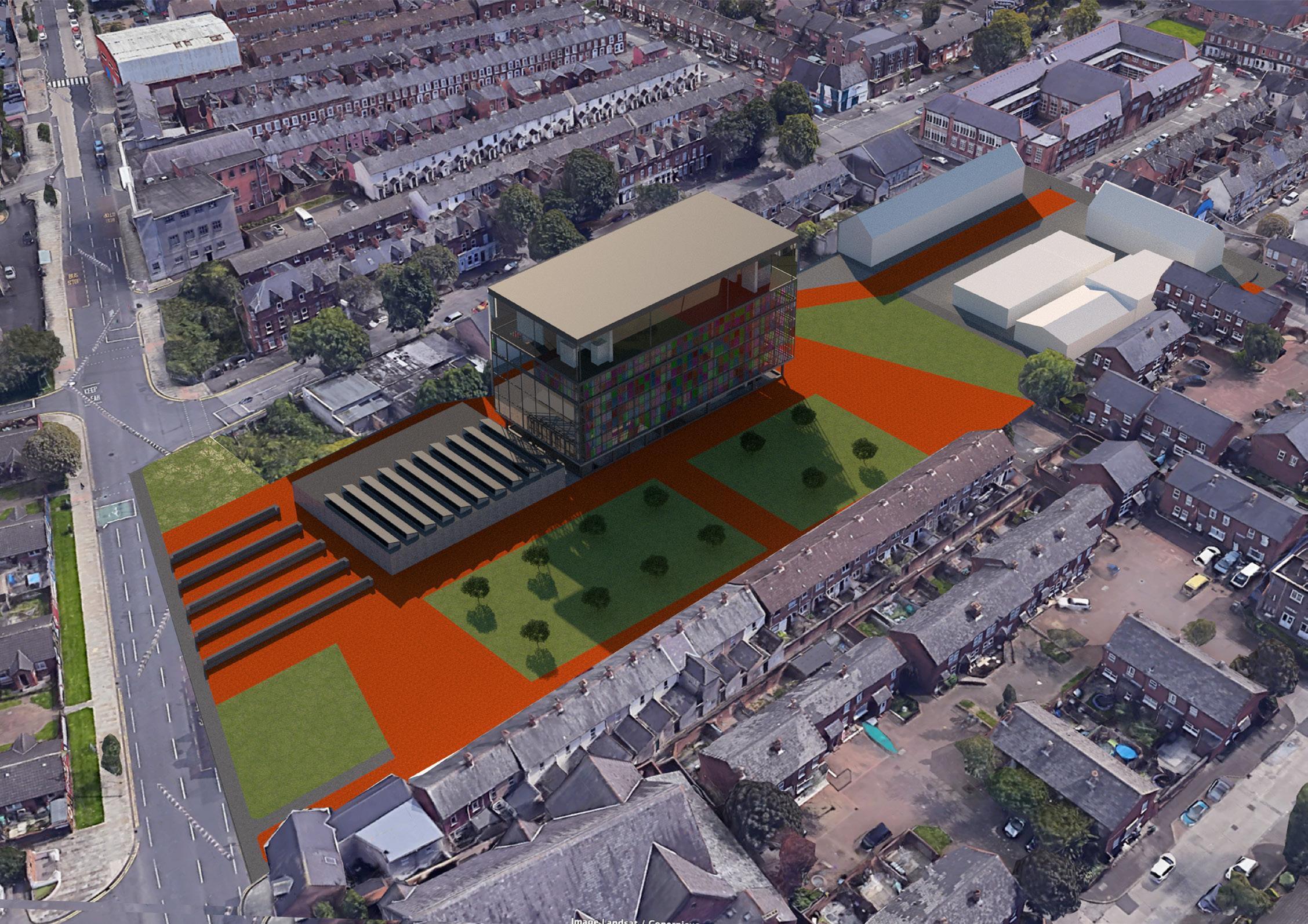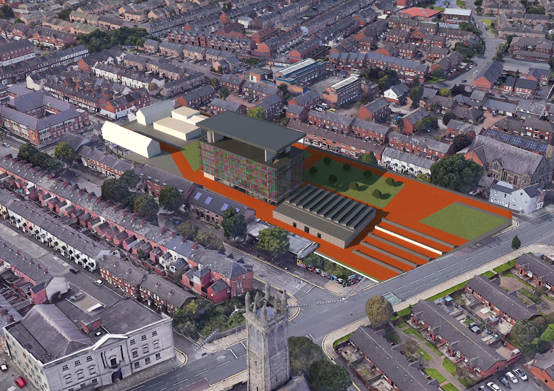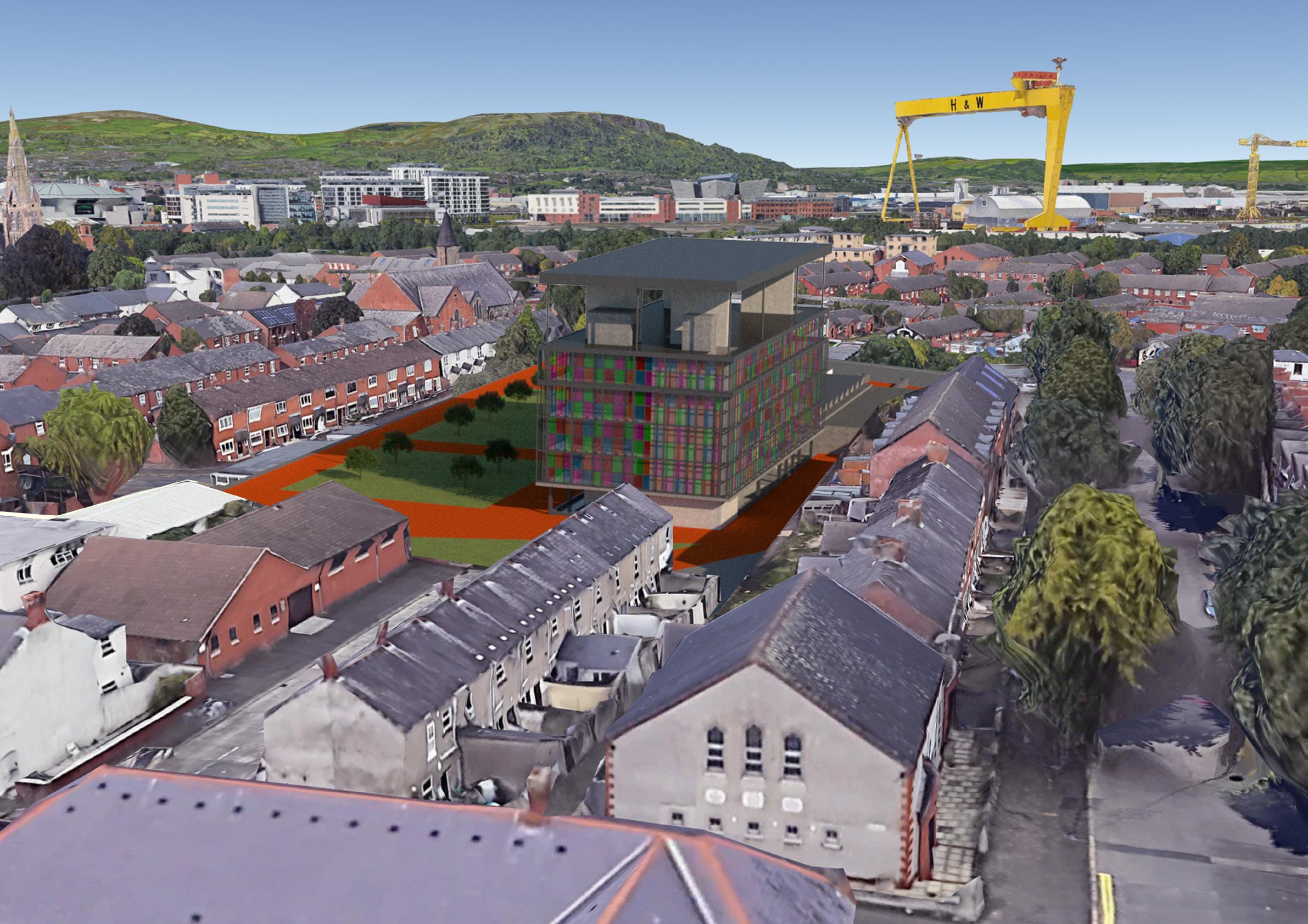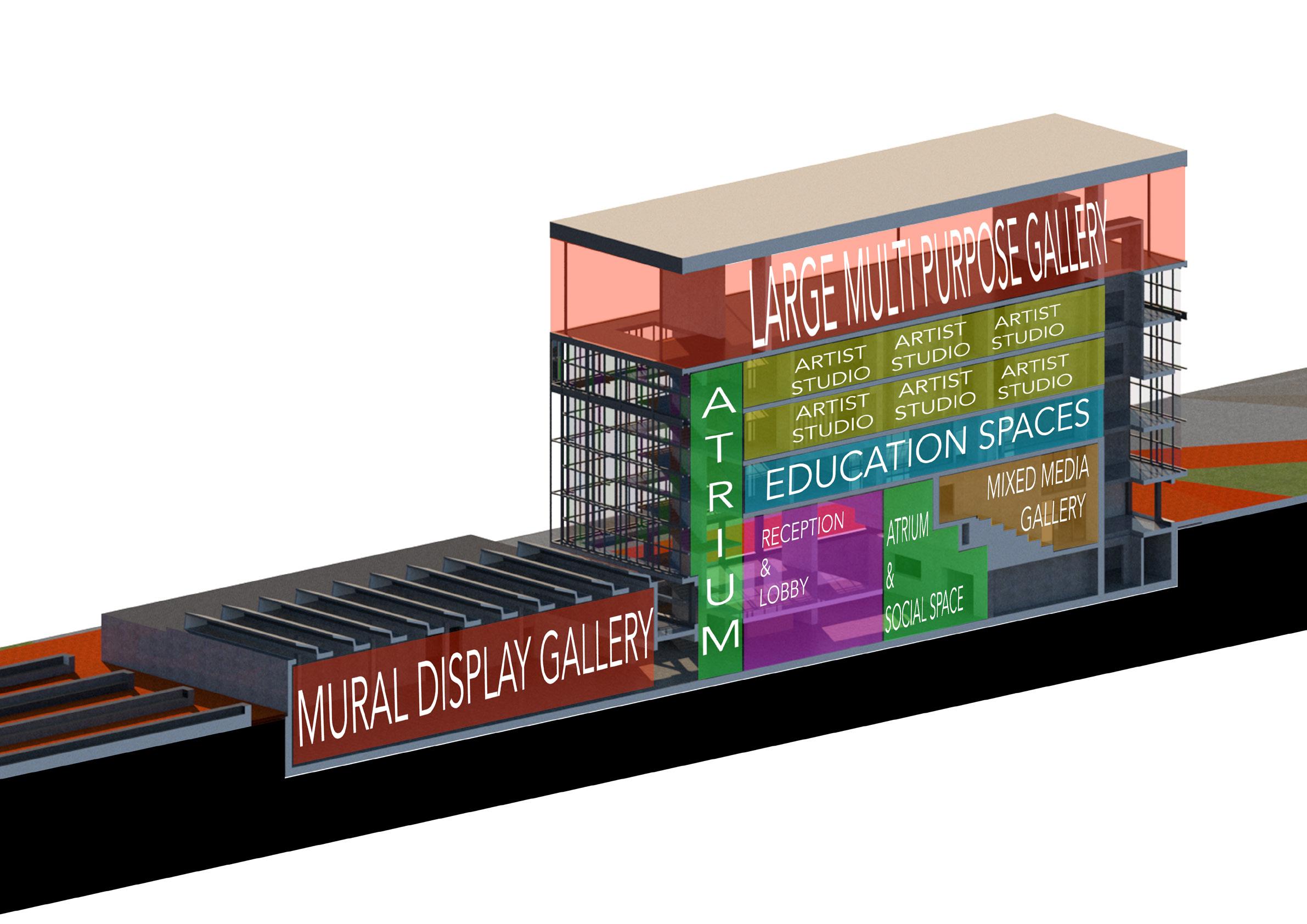 This project aims to serve as a cultural hub that will help to educate aspiring artists on the creation of murals. Providing working and teaching environments that promote collaboration to help inspire and review the creative process. It also aims to give local artists a place to showcase and develop their work with the hopes that their art will then spread into the greater East Belfast area. In order to achieve this the proposed building will include: