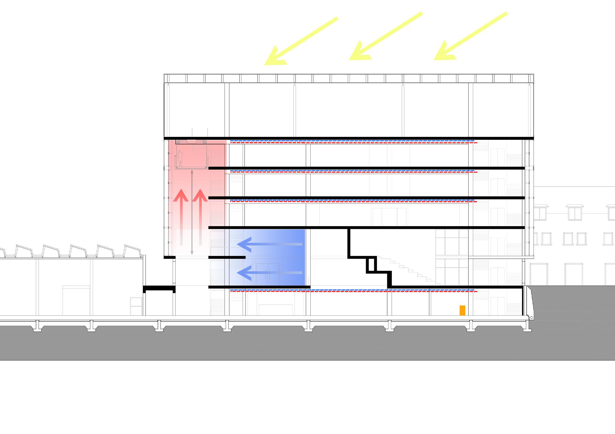 This building has been designed to be as sustainable as possible utilising many different environmental strategies such as, passive solar design to reduce the need for mechanical lighting, photovoltaic panels, heat recovery ventilation and stack effect ventilation as well as the use of low carbon concrete.