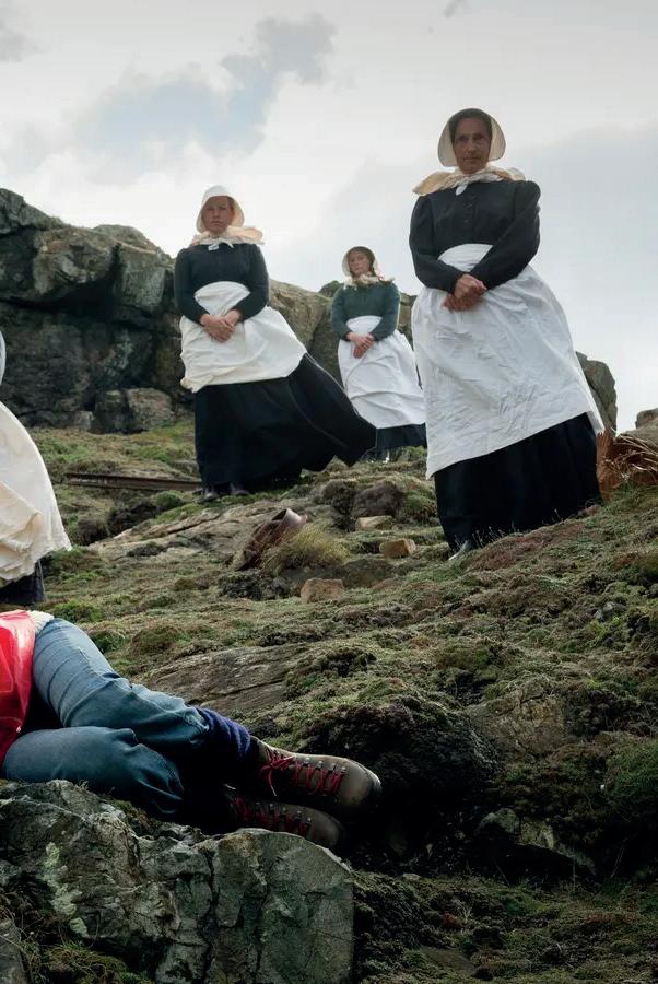 exclusively as a symbol of how the individual relates to the film’s true protagonist: the island. Throughout this film the volunteer is bombarded with a set of visions which conflict and recur: she returns to her house each day and eats and sleeps there, yet also regularly sees it dilapidated; she sees a young woman ambiguously either her daughter or herself at a younger age; she sees miners dead underground, and local women from a previous century on the hills; and she regularly encounters the boatman, who delivers her fuel, both as a sexual partner and a drowned corpse. On the surface, these conflicts – which remain unresolved – produce a narrative which refuses to prioritise one singular chronology or plot, instead presenting pieces of differing chronologies and differing plots which interrupt and merge with each other, and, consequently, all come to be presented as equally true. In this jarring and sustained interspersion, each moment is an isolated feature within the chronology of the narrative, and yet also a foundational, deliberately employed aspect of it. This dichotomy, combined with the way in which the visions also blend past and future, renders the film atemporal – or, rather, gives it a kind of
