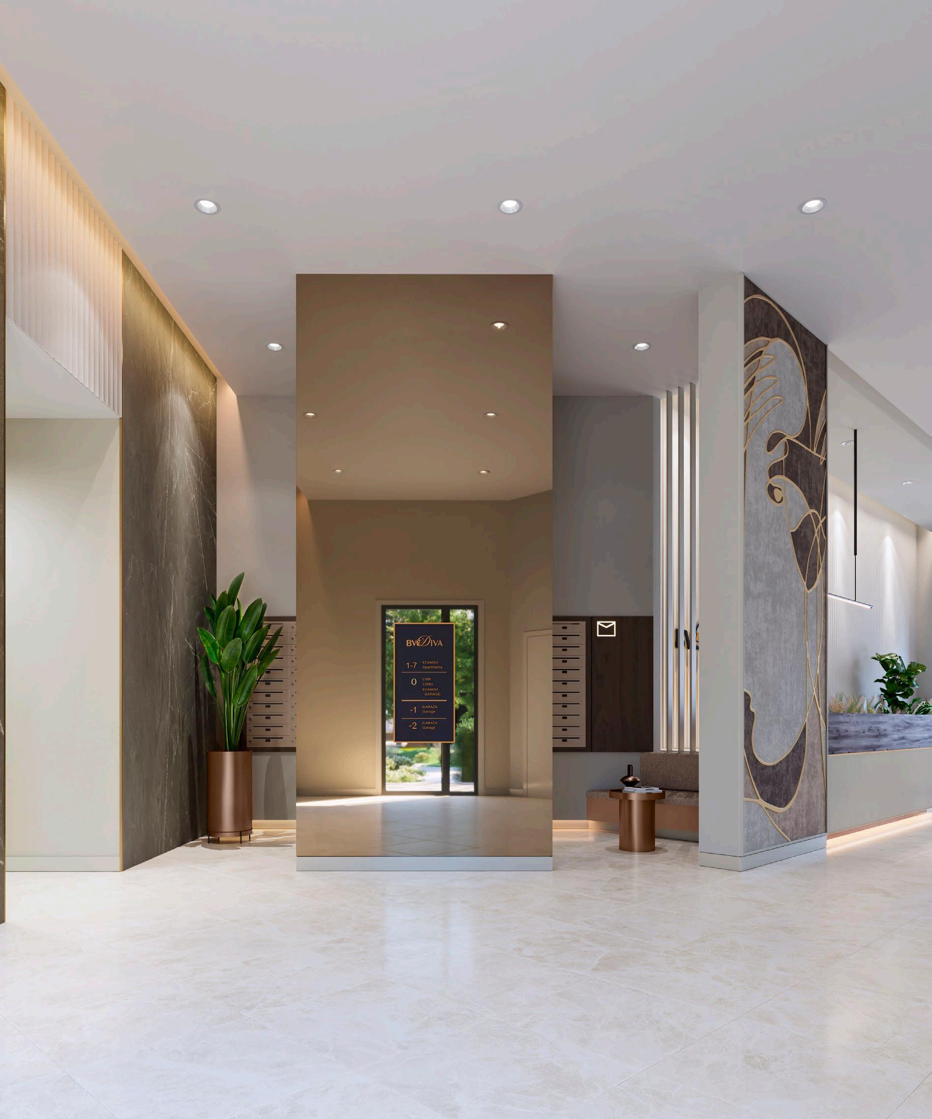 BW Diva features two main entrance lobbies, each offering reception services and 24/7 security, as well as a dedicated mailroom. For additional access, there is a separate entrance leading directly from the beautifully landscaped inner courtyard, creating a tranquil transition between the exterior and interior of the building. Parking is organised in a shared two-story underground garage with 206 parking spaces, ensuring ample room and security for vehicles, along with a designated bicycle storage area.