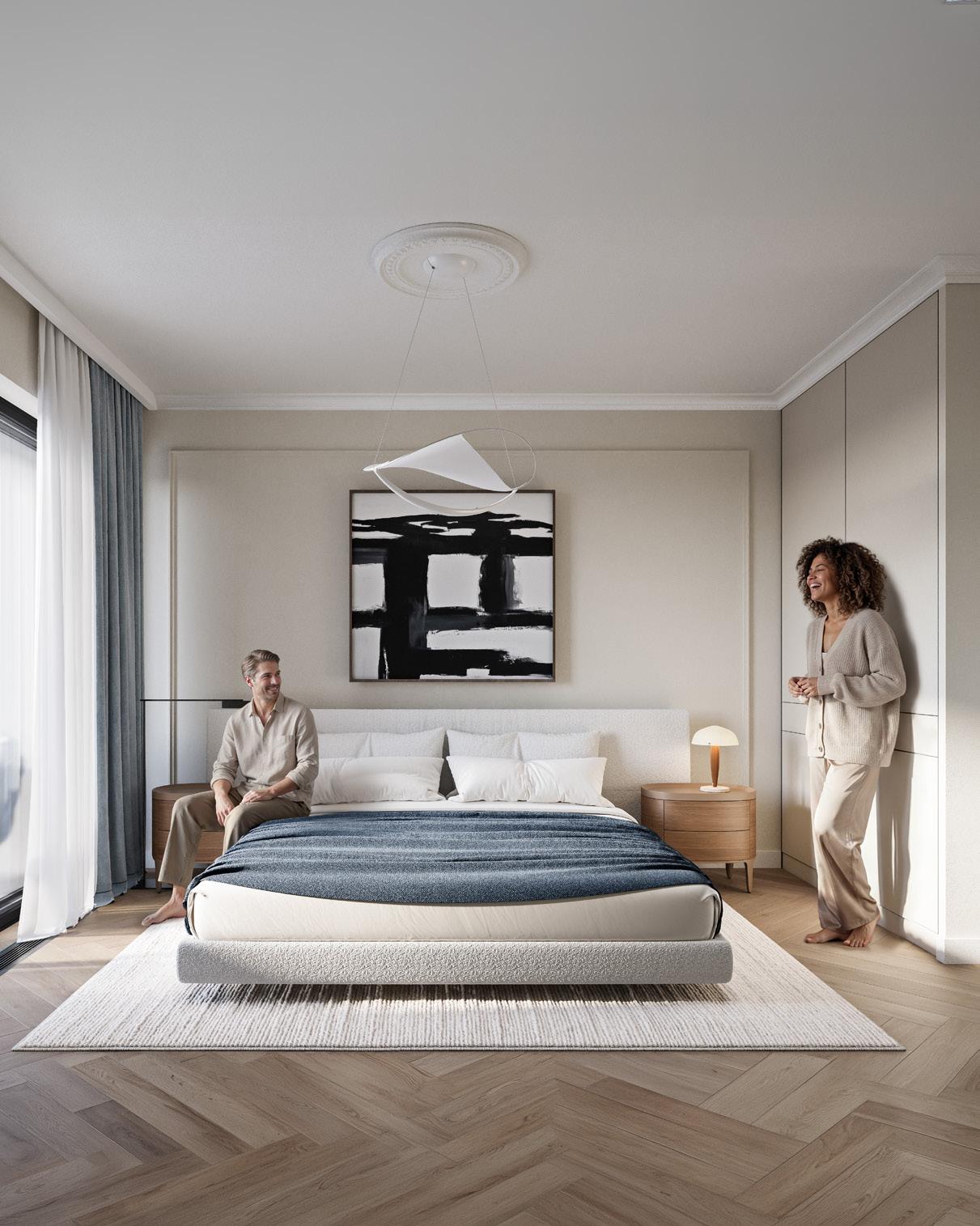 All bathrooms are fitted with premium sanitary ware, towel dryers, built-in showers with glass screens, modern vanity units with ample storage, and acrylic bathtubs in secondary bathrooms of three- and four-bedroom apartments. Apartments are equipped with central district heating via floor convectors, complemented by a multi-split air-conditioning system. The internal units are discreetly hidden within suspended ceilings in both living rooms and bedrooms, while the external unit is neatly positioned on the balcony.