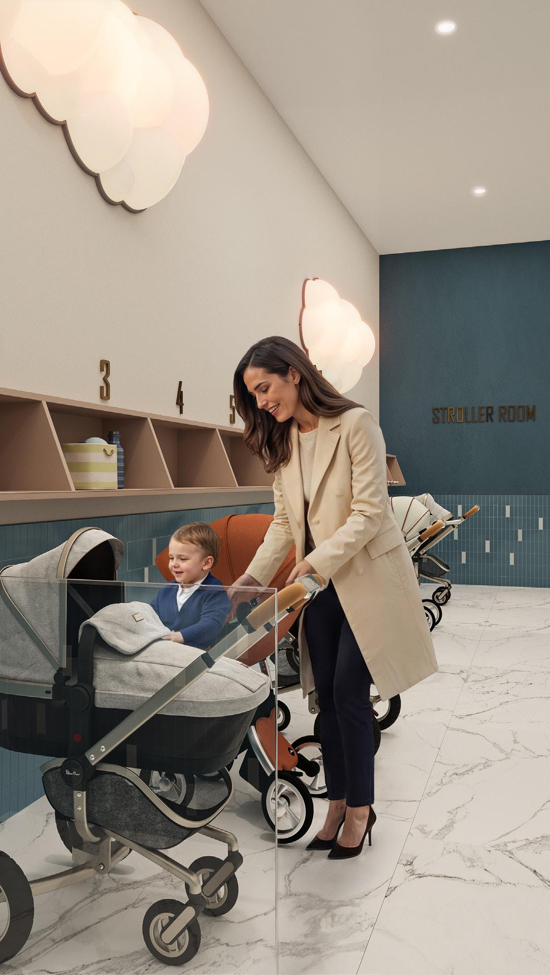 The building features a spacious entrance lobby with a reception and dedicated mail area, complemented by a pet station, bicycle storage, and stroller storage. The ground floor offers retail space and essential amenities, while residents also have access to a luxury spa with a swimming pool, sauna, and jacuzzi in the neighbouring BW Emerald building.
