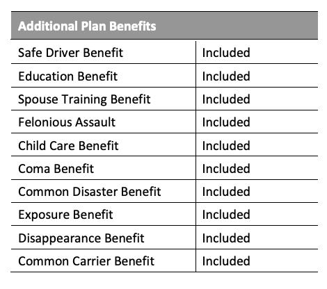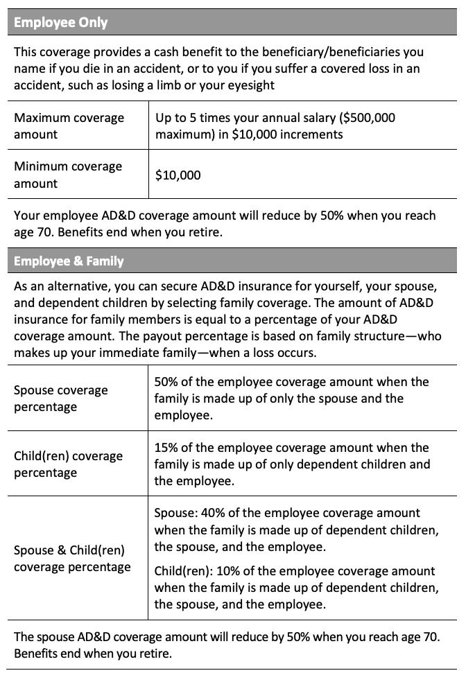 • Accident Plus - If you suffer an AD&D loss in an accident, you may also receive benefits for the following on top of your core AD&D benefits: coma, education, childcare, spouse training, and more.