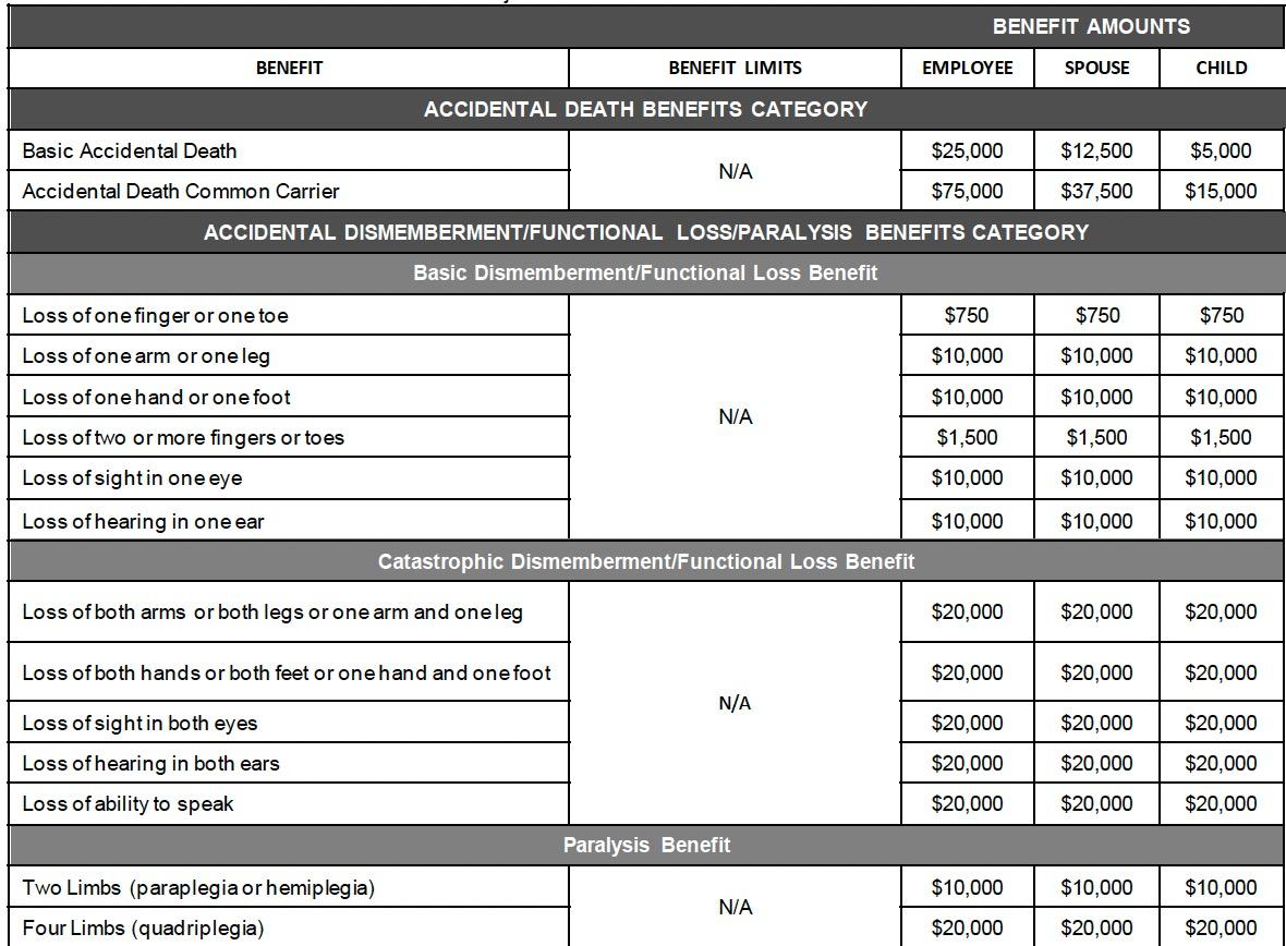 • A cash benefit to you if you suffer a covered loss in an accident, such as losing a limb or your eyesight.
