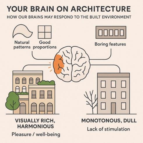 Figure 5: Conceptual illustration of how our brains may respond differently to visually rich, harmonious environments versus monotonous ones, as suggested by neuroscience (Heatherwick, 2023).