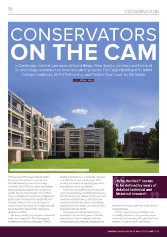 Matthew’s Project’ 1971 and ‘Sparks, Thomson and Wills, Some Notes on Housing’, 1972) extolling the benefits of upgrading redundant existing stock. So far, so prescient. To be shown around Powell and Moya’s St John’s Cripps Building, refurbished last year by R H Partnership, and Wilkins’ Trinity New Court, where the refurbishment by 5th Studio was recently completed, has been an astonishing experience for an academic architect who last practised in the late 1970s. The question of ‘who decides?’ seems nowadays to be defined by years of detailed technical and historical research, with the overarching issues of climate change and the