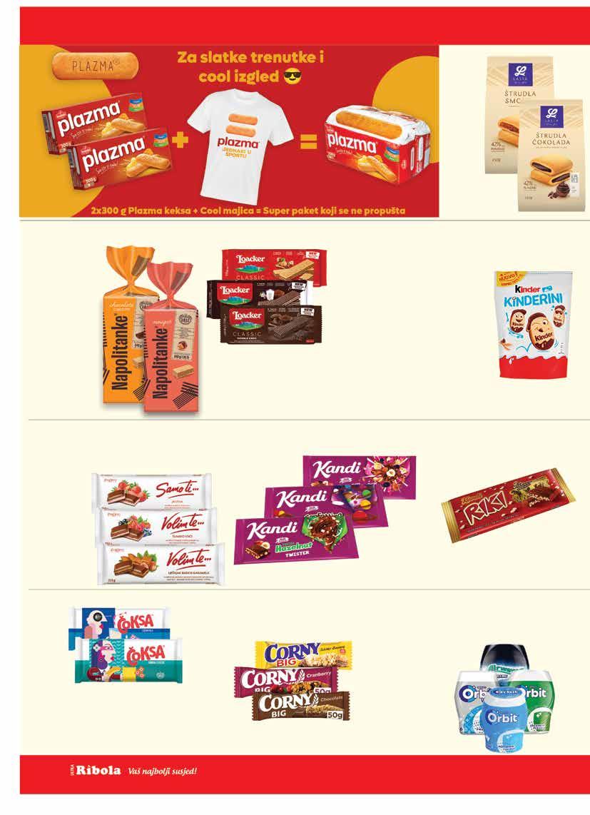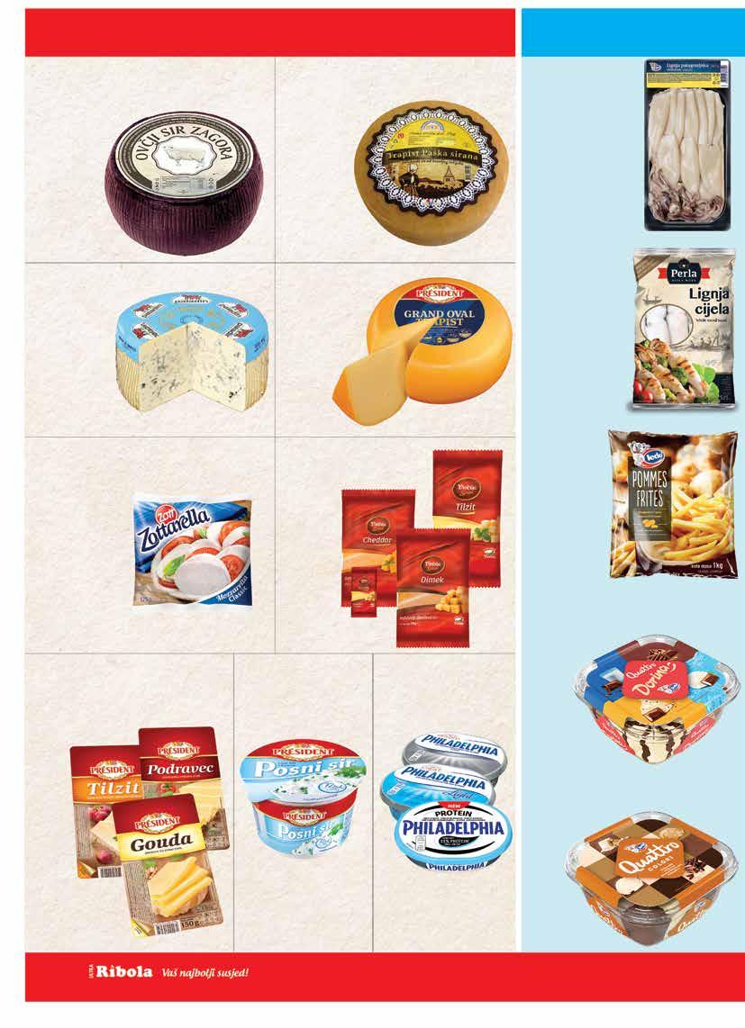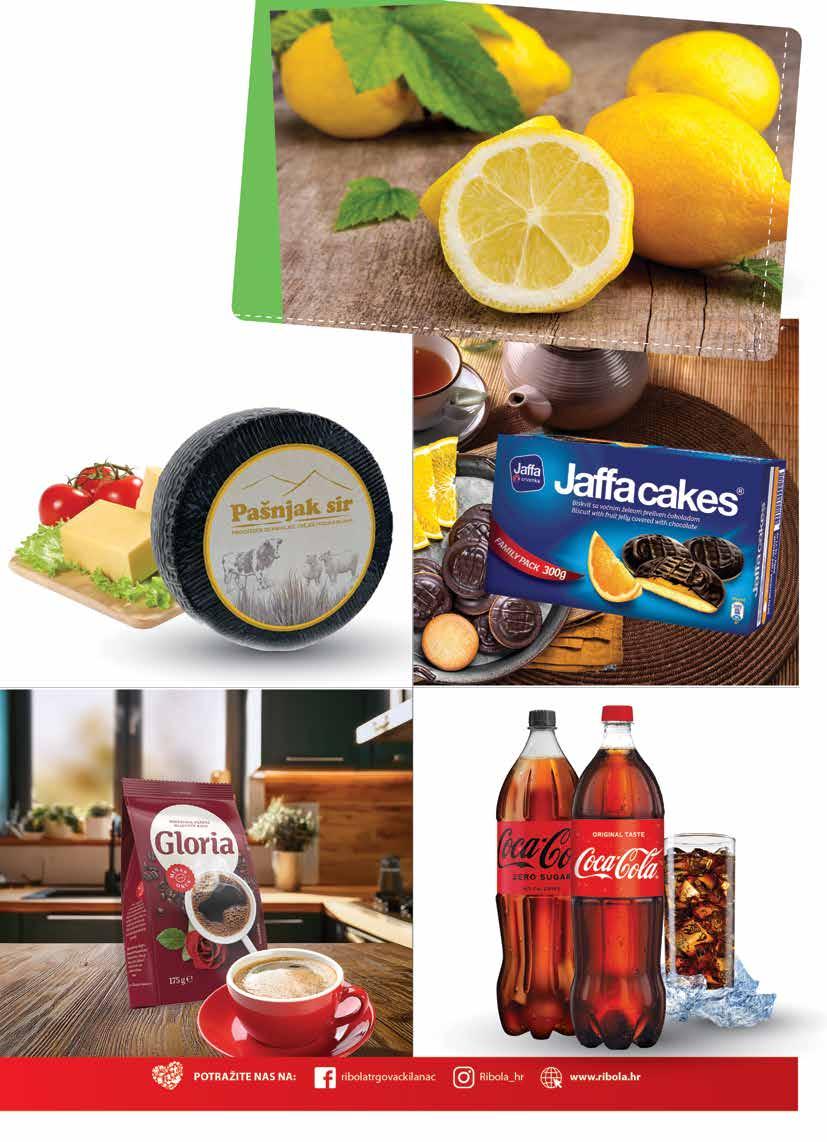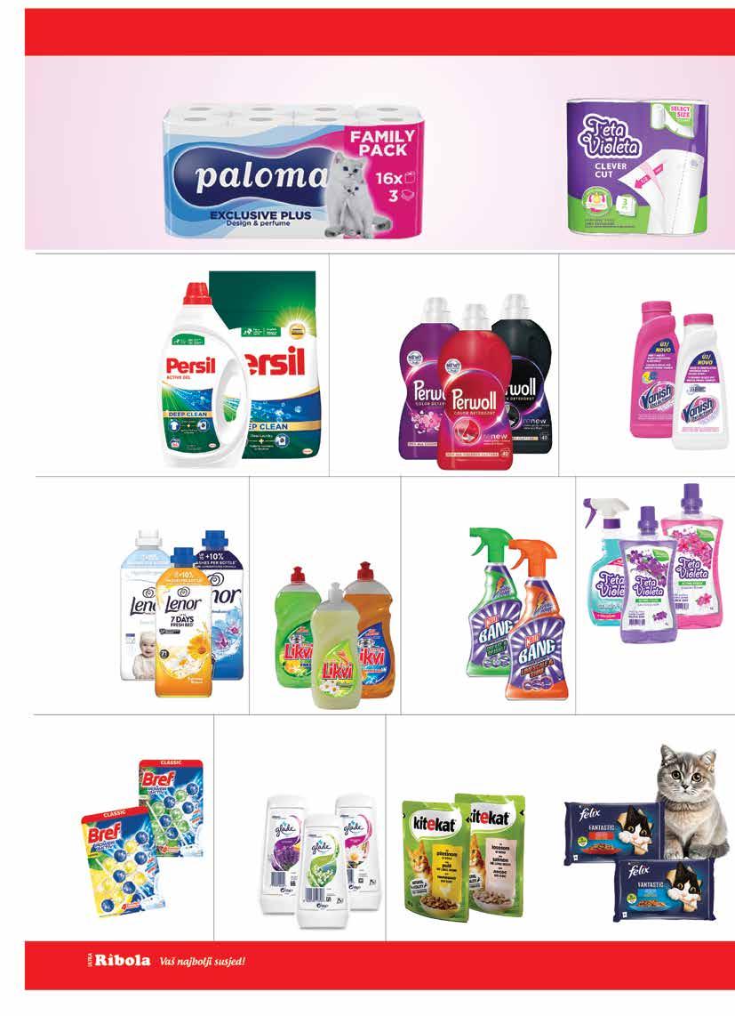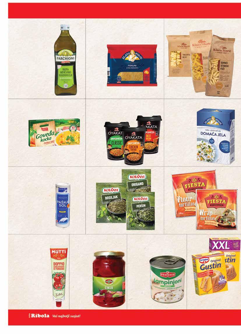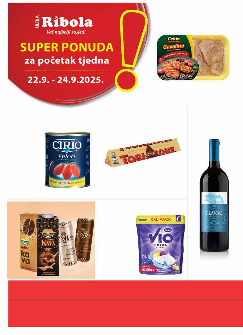 Sve cijene su maloprodajne (uračunat PDV). Ponuda iz kataloga vrijedi isključivo u prodavaonicama Ribola u periodu od 17.9. - 23.9.2025. ili do isteka zaliha. *Cijene iskazane na polici su umanjene za navedeni postotak. Zbog ograničenosti prostora, sve akcije možda nisu dostupne u svim prodavaonicama Ribola. Fotografije artikala ne moraju odgovarati stvarnom izgledu proizvoda. Ne odgovaramo za tiskarske pogreške. Hiper – ponuda je dostupna u hipermarketu Ribola. Ponuda iz kataloga se ne odnosi na poslovnice: R10 (Stjepana Radića 51, Okrug Gornji), R18 (Medena, Seget Donji), R46 (Huljerat 1a, Primošten), R58 (Put brodograditelja 16, Trogir), R64 (Šetalište kralja Tomislava 8c, Kaštel Gomilica), R74 (Splitska 22 Primošten), R53 (Gat Svetog Duje, Split), R60 (Nečujam b.b., Šolta), R62 (Miline donje