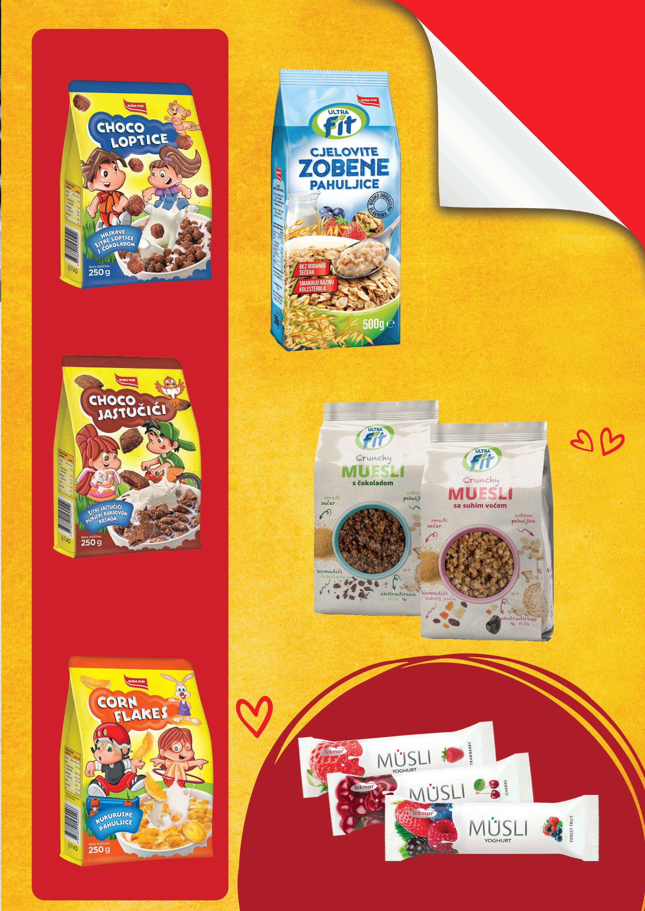 Nove ponude pogledajte na: www.ribola.hr 7 hiper super hiper ULTRA Fit hrskavi muesli • s voćem • s čokoladom 250 g ULTRA Fit Zobene pahuljice 500 g MÜSLI Pločice odabrane vrste 30 g ULTRA PLUS Čokoladne kuglice 250 g ULTRA PLUS Čokoladni jastučići 250 g ULTRA PLUS Kukuruzne žitarice 250 g -25% 1,59 €/11,98 kn 1 19 897 -25% 1,06 €/7,99 kn 0 79 595 -28% 1,66 €/12,51 kn 1 19 897 -19% 1,32 €/9,95 kn 1 06 799 POVOLJNA CIJENA 8 97 119 ULTRA dobar doručak po super cijeni! ULTRA kvaliteta ULTRA kvaliteta ULTRA kvaliteta ULTRA kvaliteta ULTRA kvaliteta snaguDoručakdaje!• 0,5 l • 110 g zobenih pahuljica • 2 žlice meda • malo cimeta • šaka orašastih plodova U uzavrelo mlijeko dodati zobene pahuljice i cimet, te kuhati 10 tak min uz povremeno miješanje. Na kraju dodati grubo nasjeckane orašaste plodove i med. Možeš jesti hladno, možeš jesti toplo. Uživaj! Prvi su muesli nastali 1900-tih u Švicarskoj. Muesli možete kombinirati s mlijekom, jogurtom ili prirodnim sokom. Njemačka riječ muesli označava žitne pahuljice s voćem. Zanimljivo 2+1 GRATIS Štedidan!svaki € 1 € = 7,53450 kn