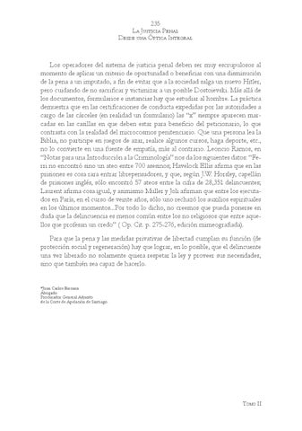 Los operadores del sistema de justicia penal deben ser muy escrupulosos al momento de aplicar un criterio de oportunidad o beneficiar con una disminución de la pena a un imputado, a fin de evitar que a la sociedad salga un nuevo Hitler, pero cuidando de no sacrificar y victimizar a un posible Dostoievski. Más allá de los documentos, formularios e instancias hay que estudiar al hombre. La práctica demuestra que en las certificaciones de conducta expedidas por las autoridades a cargo de las cárceles (en realidad un formulario) las “x” siempre aparecen marcadas en las casillas en que deben estar para beneficio del peticionario, lo que contrasta con la realidad del microcosmos penitenciario. Que una persona lea la Biblia, no participe en juegos de azar, realice algunos cursos, haga deporte, etc., no lo convierte en una fuente de empatía, más al contrario. Leoncio Ramos, en “Notas para una Introducción a la Criminología” nos da los siguientes datos: “Ferri no encontró sino un ateo entre 700 asesinos; Havelock Ellis afirma que en las prisiones es cosa rara entrar librepensadores, y que, según J.W. Horsley, capellán de prisiones inglés, sólo encontró 57 ateos entre la cifra de 28,351 delincuentes; Laurent afirma cosa igual, y asimismo Muller y Joli afirman que entre los ejecutados en París, en el curso de veinte años, sólo uno rechazó los auxilios espirituales en los últimos momentos...Por todo lo dicho, no creemos que pueda ponerse en duda que la delincuencia es menos común entre los no religiosos que entre aquellos que profesan un credo” ( Op. Cit. p. 275-276, edición mimeografiada). Para que la pena y las medidas privativas de libertad cumplan su función (de protección social y regeneración) hay que lograr, en lo posible, que el delincuente una vez liberado no solamente quiera respetar la ley y proveer sus necesidades, sino que también sea capaz de hacerlo. *Juan Carlos Bircann. Abogado. Procurador General Adjunto de la Corte de Apelación de Santiago.