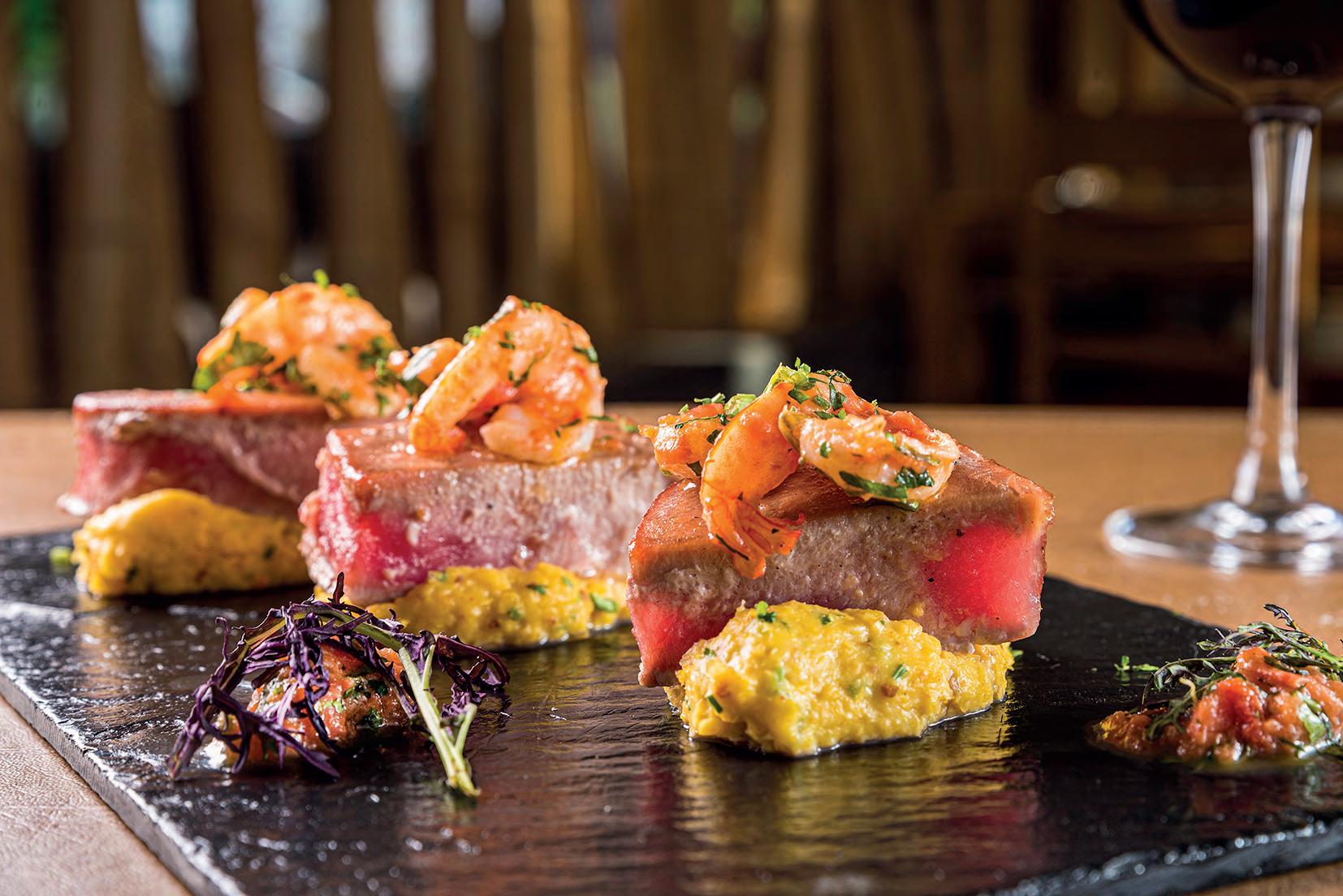 Su carta también mantie ne una antiquísima receta, que nació cuando el territo rio nordestino todavía no contaba con electricidad y en las casas no existía la refrigeración: la carne-de-sol. Una posta que dejan salando durante tres días para preservarla, y que luego sellan en una chapa, sirviéndola con queso, farofa y vinagreta.