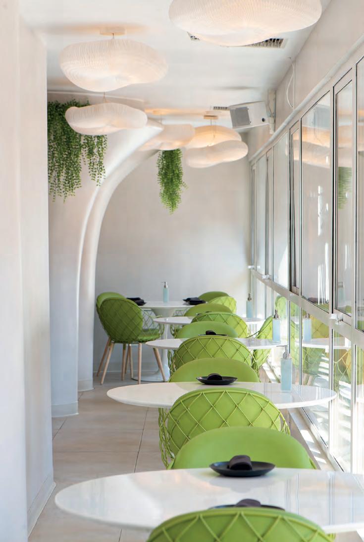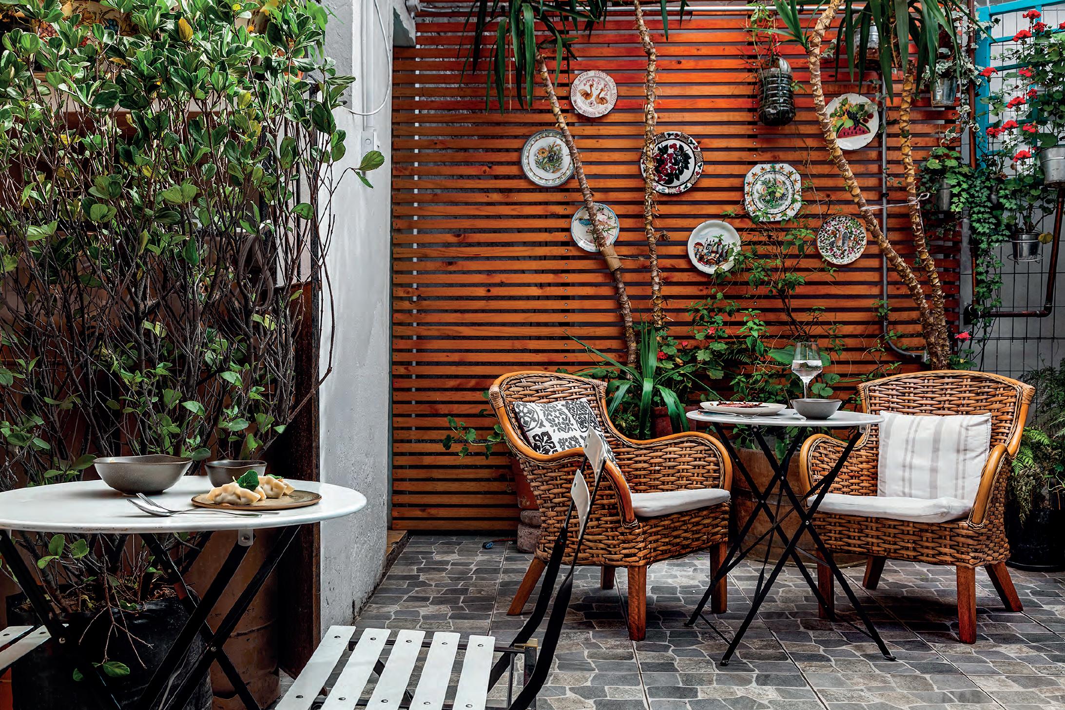 El lugar tiene un salón con ocho mesas y también recibe a sus comensa les en espacios abiertos y comunes con los otros locales de la galería: una terraza delantera y otra situada al fondo que, en total, suman 13 mesas más.