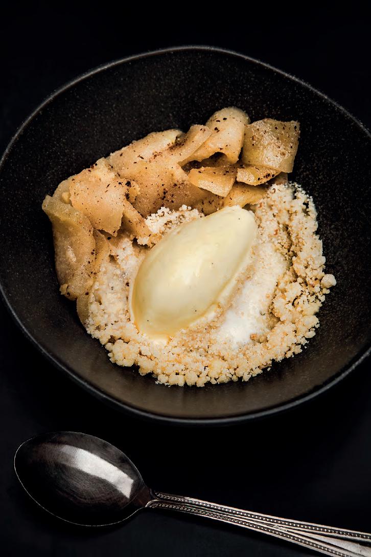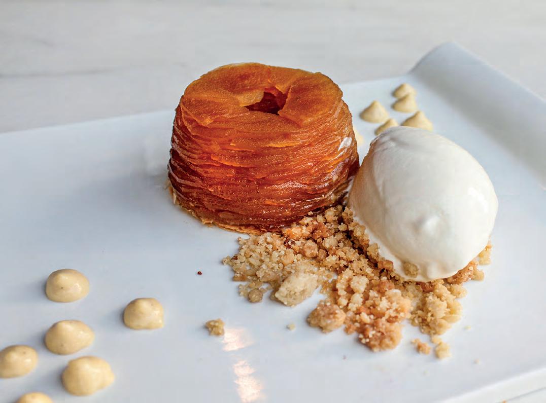 Tarta de manzana. Lleva la fruta caramelizada con canela, espuma de yuzu, crumble y helado de vainilla