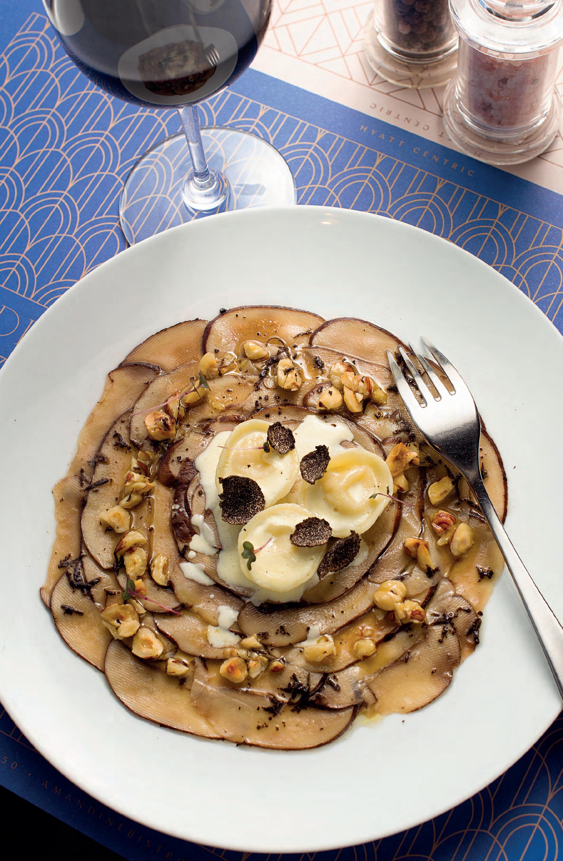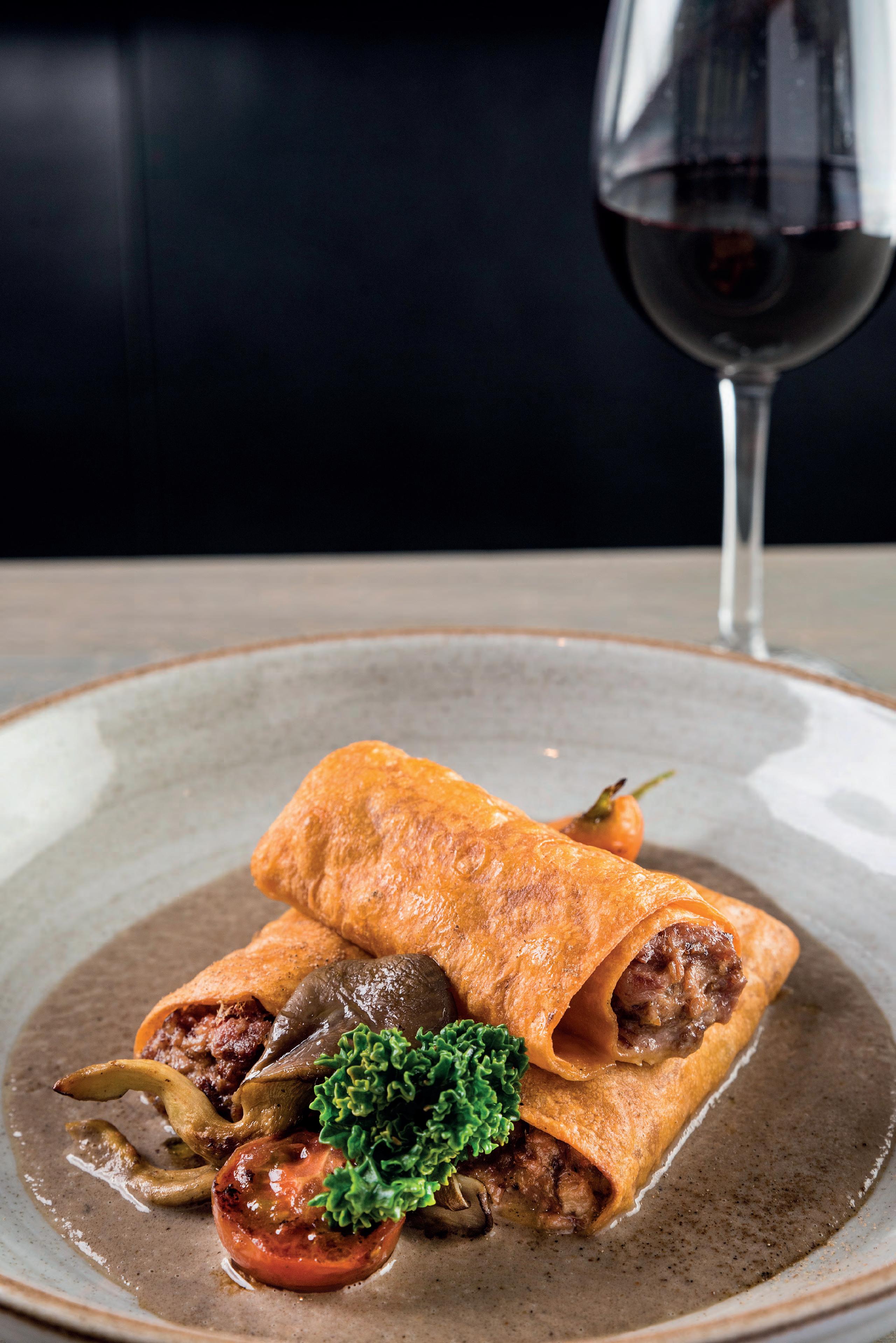 La carta de Masa Bistró cuenta con cerca de 12 platos y la variedad de estos es una de las principales cualida des del restaurante: el comensal puede encontrar ostras, pescado fresco, carne de libre pastoreo, pato, pulpo y también opciones vegetarianas y veganas, como hongos shiitake salteados con demi-glace de hongos y choclo hecho pastelera, una prepara ción de verano, sencilla y con mucho sabor que, al cambio de temporada, dio paso a dumplings rellenos de hongos shiitake y papa camote, servidos con emulsión de miso y dashi basado en legumbres.