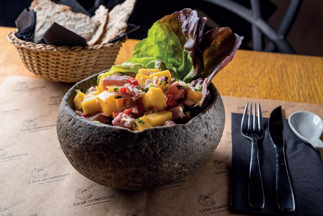 Cuando van a Masa Bistró, los comensales disfrutan de un espacio con estilo industrial, donde luce mobiliario de madera nativa y fierro forjado. En lo gastronómico, el concep to fue fortaleciendo su carácter con el paso del tiempo, pues Sayil Guerra quería mantener lo iniciado en pande mia, pero diversificándolo a un bistró que define como cocina sencilla con alta técnica, incluidos procesos sous-vide. El chef añade: “Los platos que tenemos en el local no tienen más allá de tres preparaciones para una gestión rápida, incluyendo montaje y salida”.