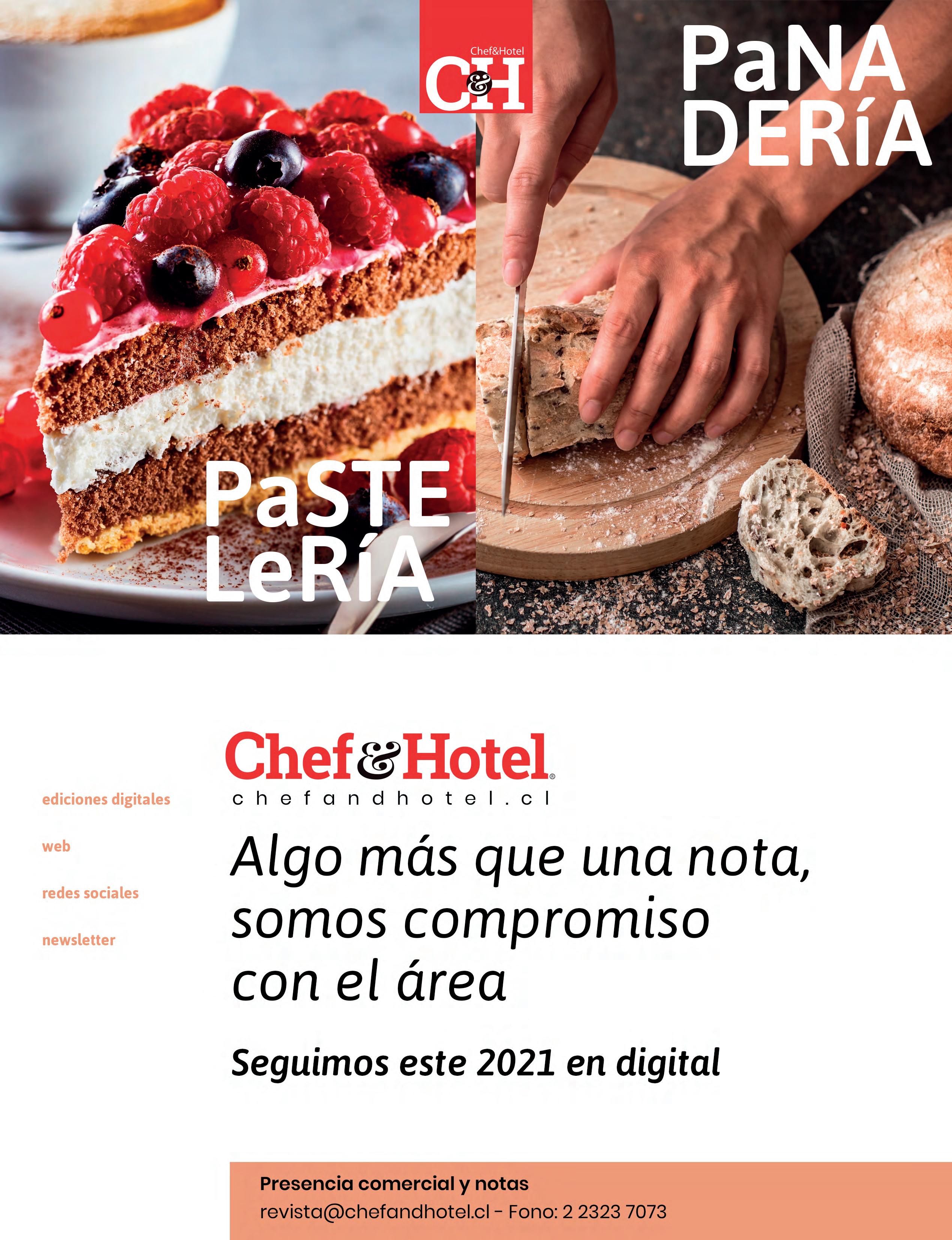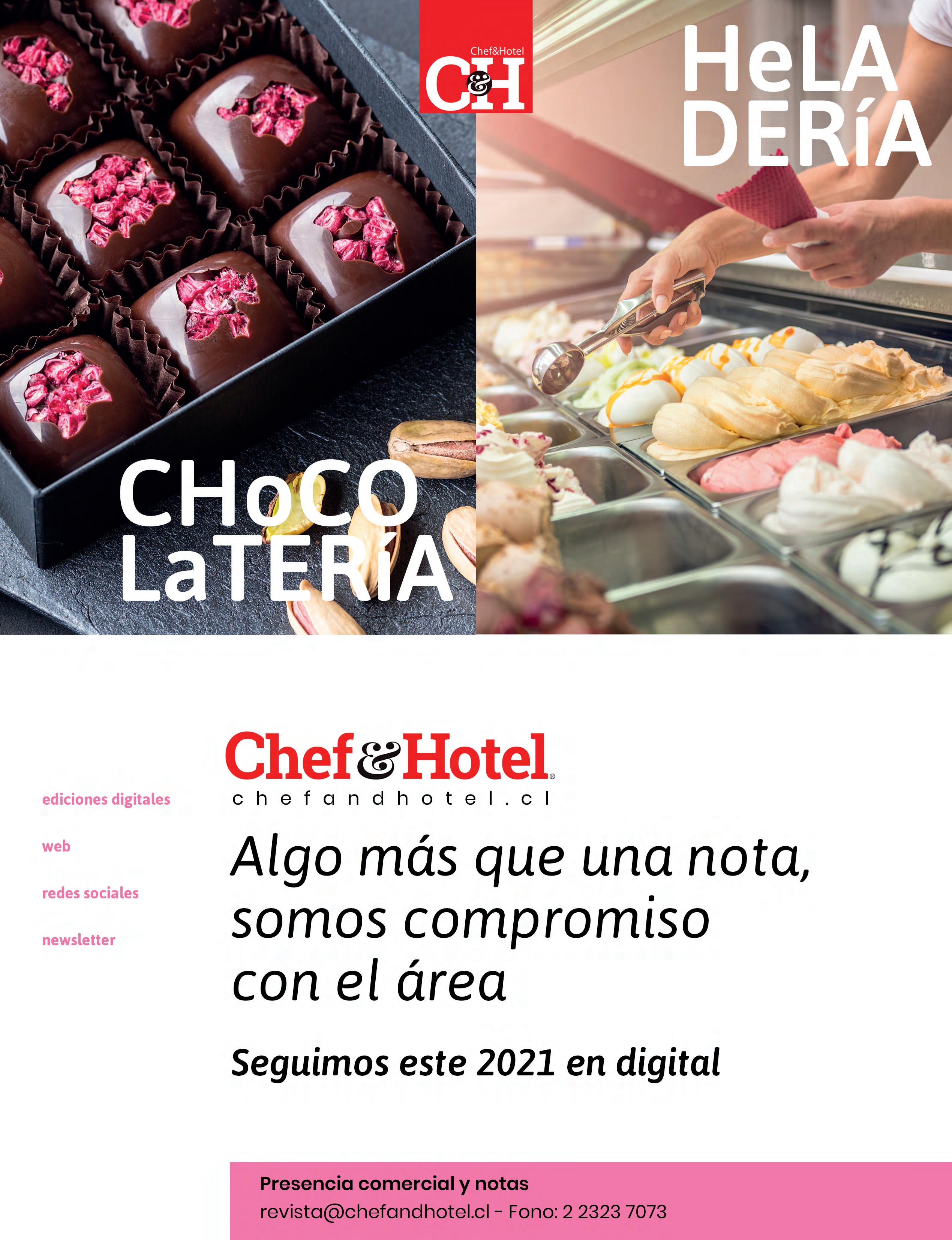 Al momento de publicarse online la presente edición de Chef&Hotel, gran parte de la población del país se encuentra sometido a una nueva ola de conta gios de Covid-19, lo que llevó por parte de la autoridad sanitaria a la aplicación de cuarentenas más restrictivas para bajar la movilidad y con ello la positividad. El trabajo realizado por el equipo de profesionales periodistas y fotógrafos de Chef&Hotel desde junio de 2020, tuvo que adecuarse a estos vaivenes de las condiciones de trabajo con impedimentos para realizar reporta jes en terreno, como era tradicional en la línea editorial de cada número y que la ha caracterizado durante estos 18 años de ediciones. Pero para lograr mantener nuestro nivel de contenido de reportajes y fotográfico, como muchos otros trabajos hoy en día, Chef&Hotel se ha tenido que adaptar y aprovechar algunos cambios de conducta para potenciar nuevas opciones de plataformas y así llegar a más lugares y profesionales de Chile, además de traspasar nuestras fronteras con su publica ción. Resultado de esta fórmula binaria entre terreno y vía telemática, ha sido lograr en primer lugar mantener el valor del contenido y la información que entregamos al área,