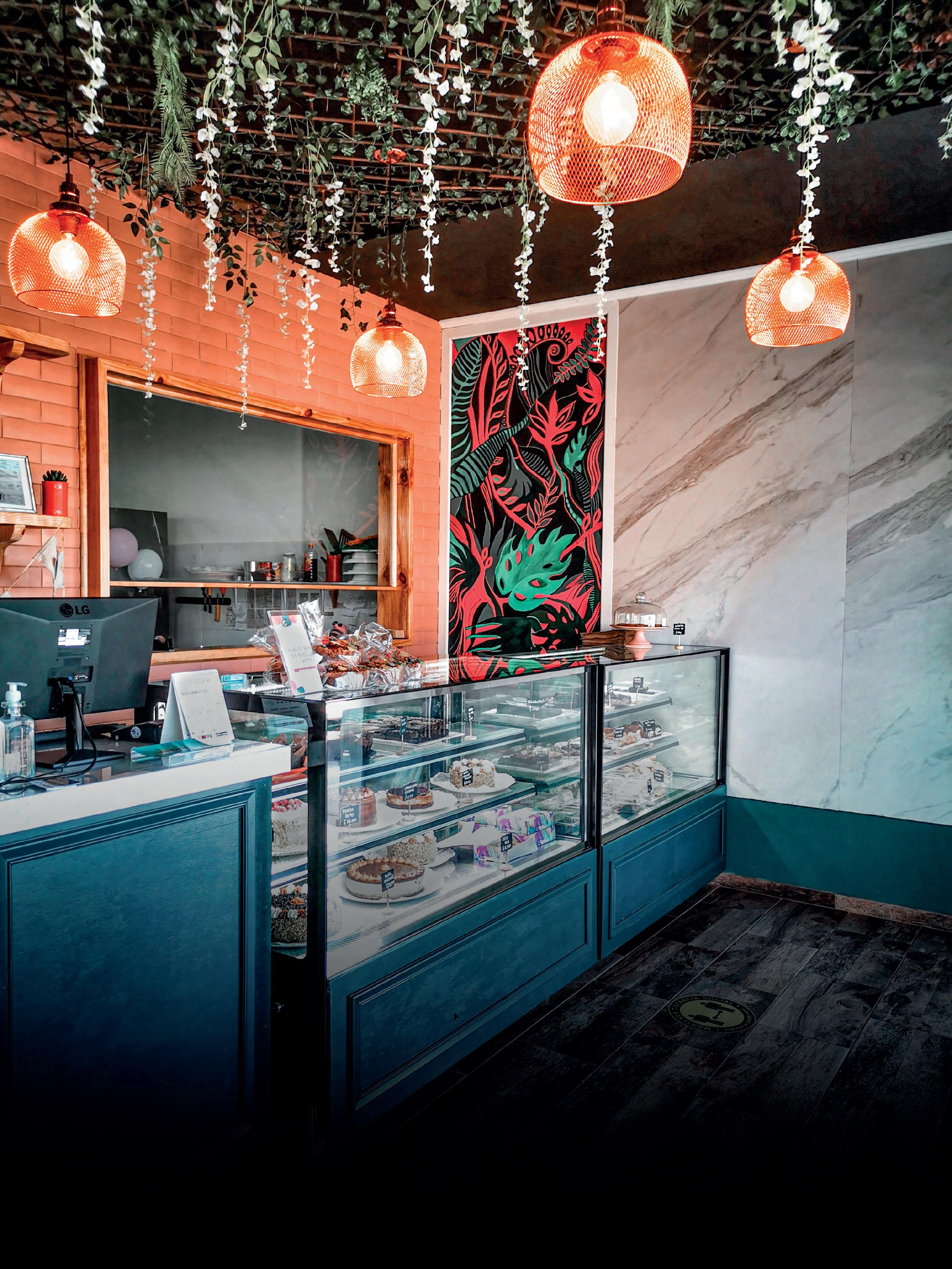 Para la ambientación, Maureen aprovechó sus estudios de diseño de ambientes “me di el lujo de poder decorar el local como yo quería. Escogí una paleta de colores con verdes oscuros, rosas, grises y toques de dorados. En el techo cuelgan plantas y lámparas doradas, tenemos dos vitrinas empotradas en un mueble estilo francés y un mesón de mármol. Además. hay un bello mural de hojas selváticas que hizo mi hermana, el cual llama mucho la atención y que sigue con la paleta de colores mencionada”.