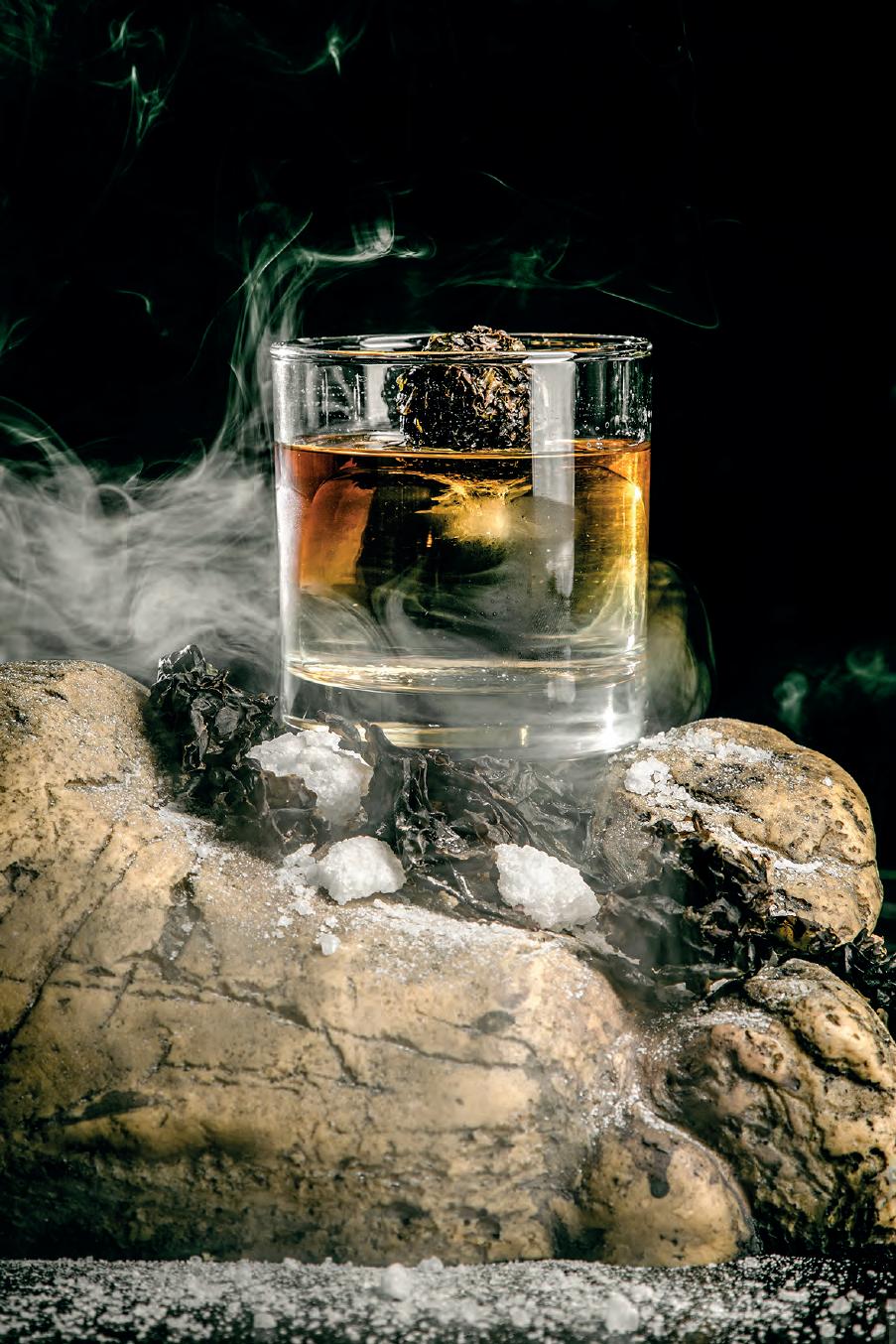 atrevidas. “El primero, Coille Beatha, Johnnie Walker Black Label infusio nado mediante sifón en hojas de eucaliptus, con la idea de contrastar lo cálido y maderoso de Black Label y sus notas de jumó y vainilla, con las notas frescas del eucaliptus. Infusión en frío de menta poleo, para llevar más lejos ese frescor potente, aceite de lavanda extraído mediante sous vide por 16hrs a 55grados, solución de ácido málico (agua con ácido de la manzana verde) y jarabe de goma simple”.