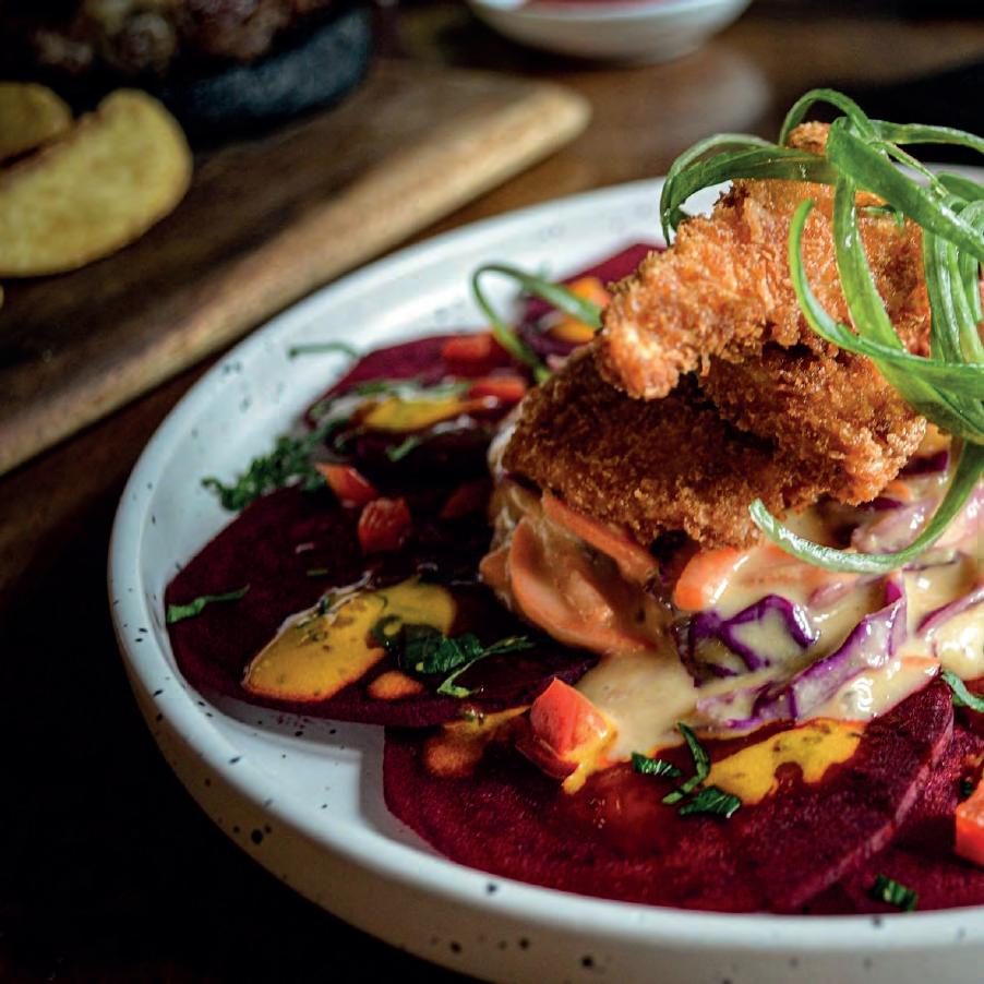 Con una base de coleslaw con naranja, pollo crispy y salsa de naranja. ($ 6.350) | bar restaurante