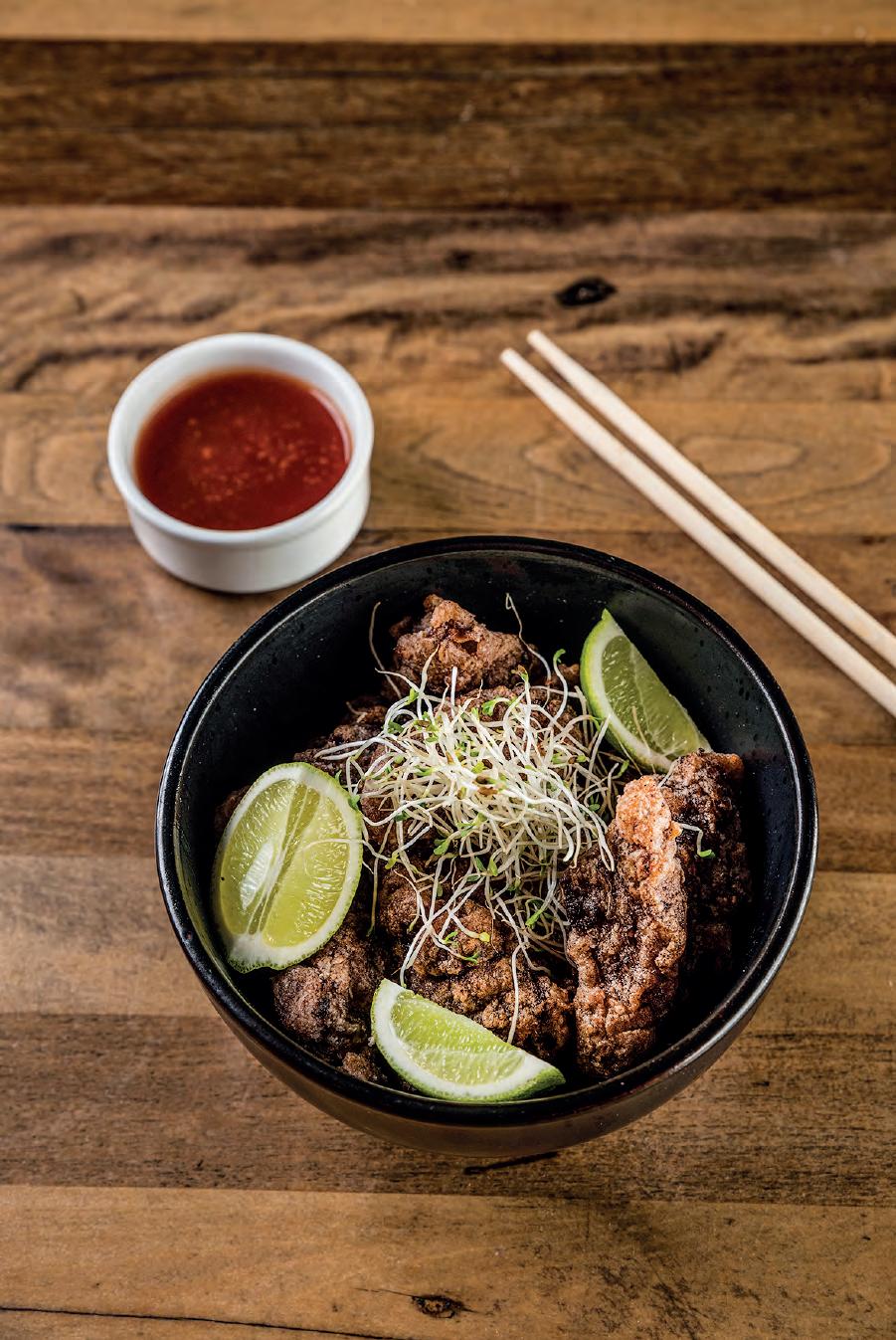 Karaage. Cubos de pollo marinados en salsa de soya, salsa de ostras, pimienta, sake, jengibre, fritos con una costra ligera y crocante, acompañado de limón y una salsa dulce picante a base de sriracha y tamarindo ($5.900)
