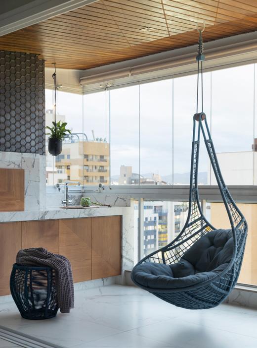 Revestida com porcelanato, a bancada da churrasqueira tem presença leve na sacada. E falando em leveza, ao invés das tradicionais poltronas, os balanços é que convidam para apreciar um belo fim de tarde na varanda
