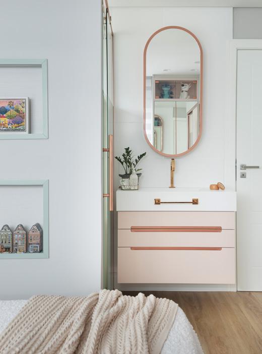Visando melhor aproveitamento do espaço e dar amplitude ao quarto, a parede do banheiro foi quebrada e a pia ficou dentro do quarto. O box e o vaso sanitário ficam separados por uma porta de vidro de correr com detalhes em Rosê Gold